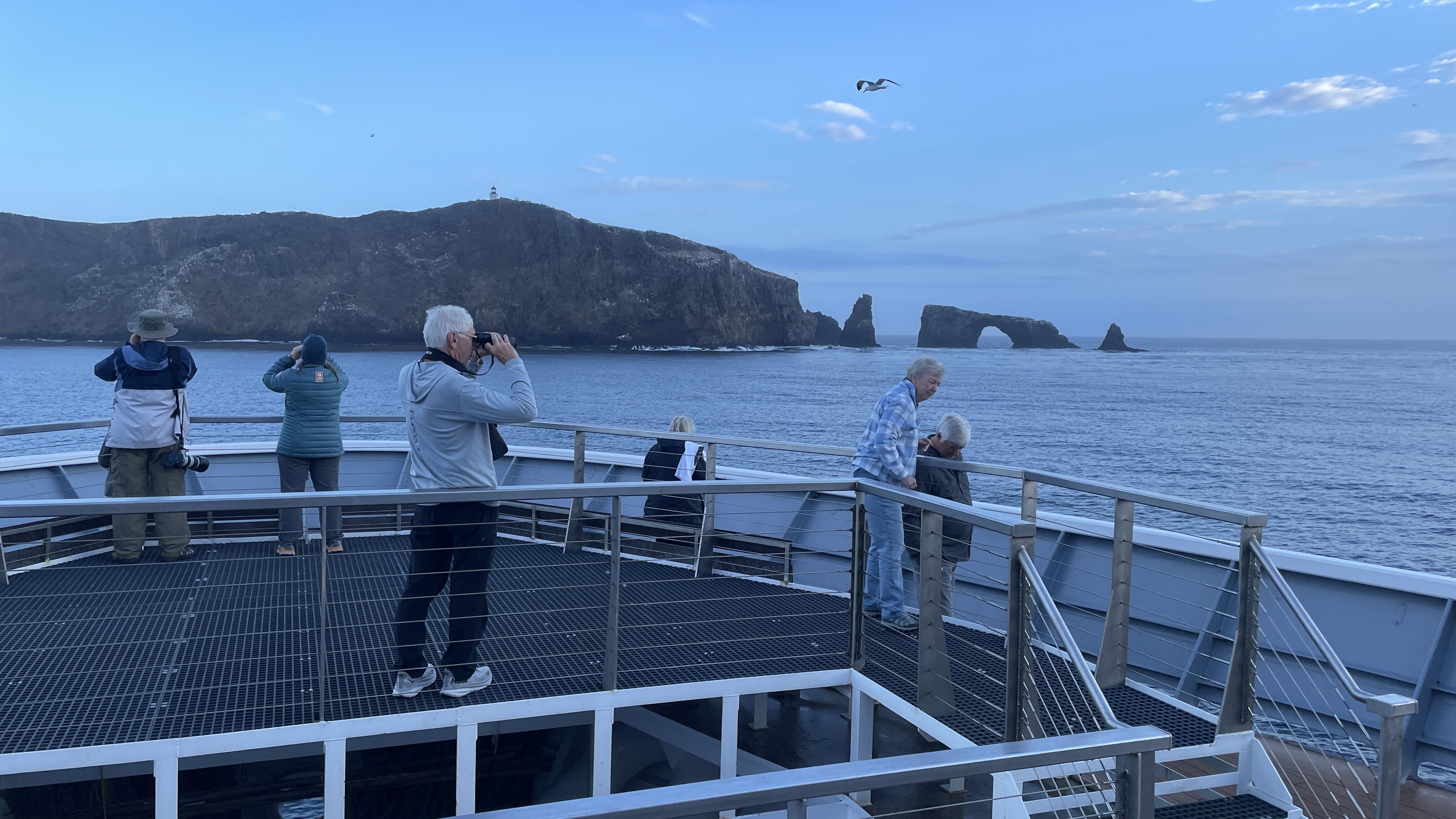 After exploring the island, we returned to the ship for lunch, during which time we repositioned to Anacapa Island, the second smallest Channel Island. We boarded Zodiacs to explore and were amazed at the California sea lions and brown pelicans feeding on bait balls all around us.
