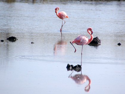 This visitor site is also home of white sand beaches, forests of giant prickly pear cacti and incense trees and a small lagoon where often, like today, we encounter shore birds, such as whimbrels, stilts, white checked pintail ducks and flamingos. The trail here took us along the brackish lagoon and then inland into the land iguana territory. The terrain was rocky and the vegetation was very dry, it was hot and humid, but we were able to spot five land iguanas, some were resting while others were in the shade and a couple were trying to feed on the cactus. Amazing to see how these animals adapted perfectly to this very dry and difficult environment.