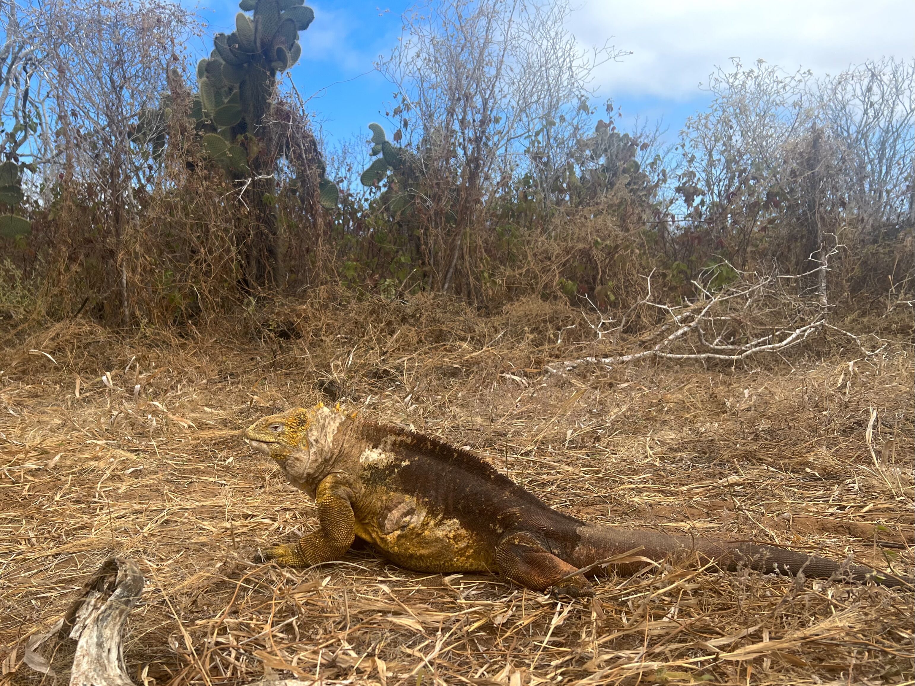 Today we explored the western part of Santa Cruz Island to find dragons. Galapagos is known for its endemic reptiles, and the last one we needed to find for our species checklist was the Galapagos land iguana, a yellow reptile with an intimidating gaze that lives in burrows and basks in the sun on many of the islands. A good place to find them is the western part of Santa Cruz at a site called Dragon Hill. This is a restored area of the national park. In Santa Cruz, we have a large human population. The area used to have a lot of introduced species, but they were locally eradicated. Iguanas bred in the research station were returned to the wild. During our hike in this dry forest, we encountered quite a few. We observed some iguanas engaged in mating behavior, which consists of a slow chase by the males with the females walking away from them. Land iguanas are a sister species of marine iguanas, but they have very different habitats and behavior. It was interesting to see their burrows and habitats. As the day warmed up, it was time to go to the water. For the rest of the morning, we snorkeled. Our hotel department offered an Ecuadorian lunch, so we got to taste many of the dishes that are part of the diverse Ecuadorian cuisine.