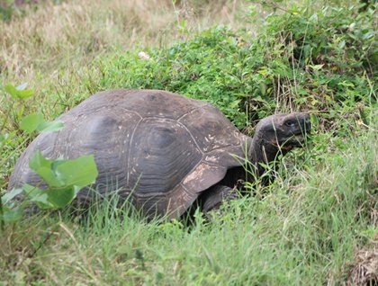 We ate a delicious buffet lunch at the farm, El Chato, and then several of us took turns crawling into an empty tortoise shell to have our pictures taken. We boarded the buses again and drove to a lower section of the farm where we went in search of giant tortoises in the lush green vegetation. We found a couple of huge males and several more of these endemic reptiles hidden in the grass and soaking in a rainwater-filled pond. Everyone had great photo opportunities of the giant tortoises although some biting introduced ants made us move along and kept up from dallying in any one spot for too long.