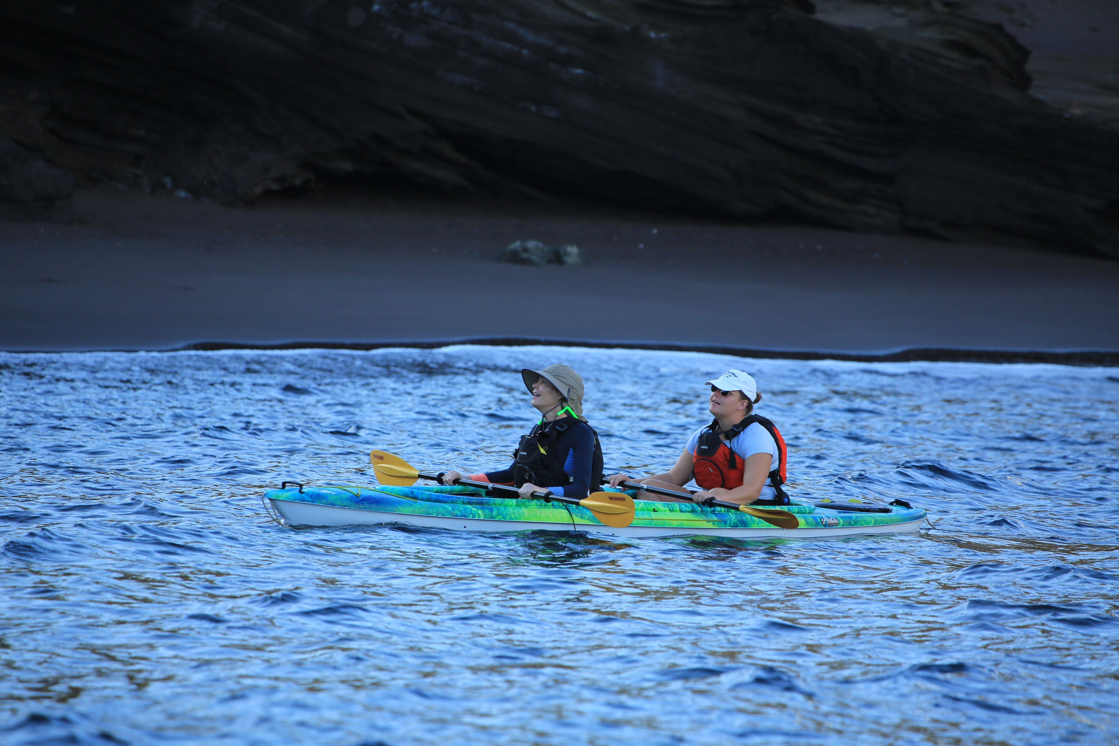 Sadly, our expedition aboard National Geographic Gemini is nearing its end. Our day began with a hike at the base of towering cliffs. A steep ascent led us to a plateau of a palo santo forest, sparse and otherworldly. Almost immediately, we were surrounded by red-footed boobies nesting in low trees and Nazca boobies on the ground. A highlight was spotting a short-eared owl perched silently among a lava crevice, camouflaged and hunting storm petrels. The calls of frigatebirds rang in the air, with their inflated red pouches on full display in a mating show. After our hike we enjoyed water activities, such as kayaking along the cliffs and snorkeling. In the late afternoon, we landed on the coral sand beach of Darwin Bay. Guests enjoyed a relaxing stroll along the shoreline bordered by mangroves and nesting bird colonies. The presence of swallow-tailed gulls, lava herons, and marine iguanas provided excellent photo opportunities.