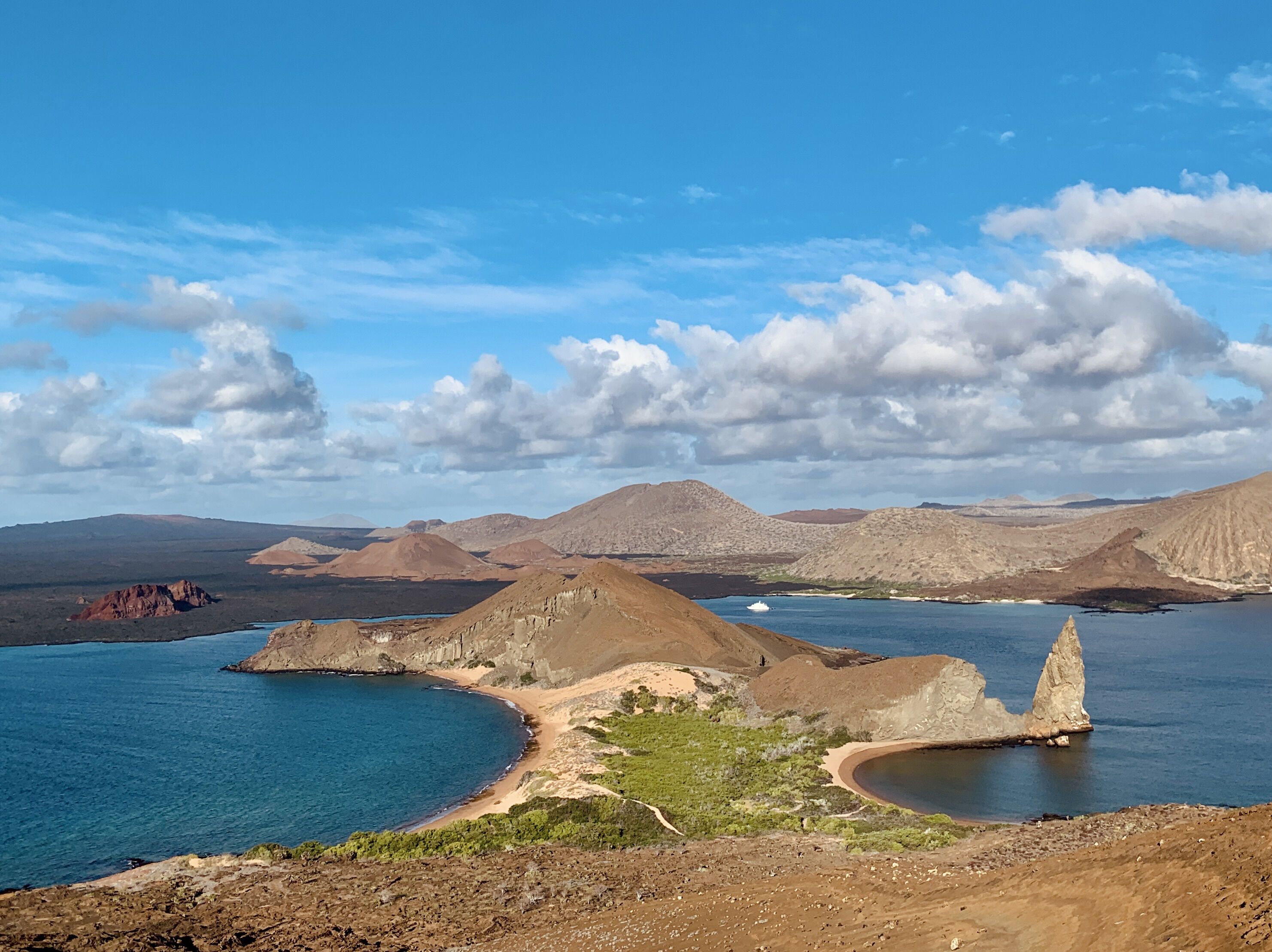 Bartolome Islet is a small volcanic island located off the east coast of Santiago Island. It is known for its distinctive Pinnacle Rock, a towering volcanic formation that rises out of the sea. The island is relatively barren, with a stark landscape of black lava rocks and sparse vegetation. Right after breakfast the guests of National Geographic Islander II landed at Bartolome and climbed to the summit to take in one of the most scenic views of the archipelago. Our guests also had the opportunity to snorkel in the waters around Pinnacle Rock, where they observed a variety of marine life including fish, sea turtles, Galapagos sea lions, and Galapagos penguins.