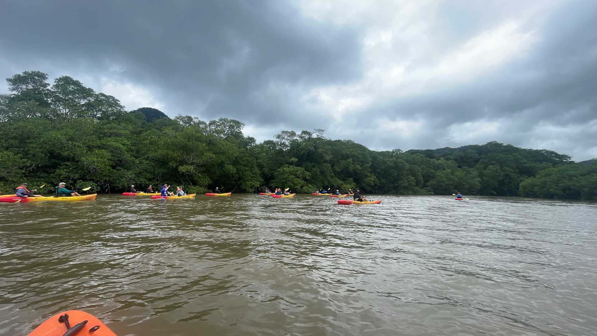 In the morning we all boarded “pangas,” small local boats used to explore and admire the rock formations and geologic history of the country. After that, we challenged our guests with a nature walk inside the tropical “dry forest,” this time with a heavy rain in between. We had a lot of laughs and joy from everybody, as we found the trails flooded and the “dry” forest very “wet.” In the afternoon, our guests divided into groups for kayaking, Zodiac rides, and a power walk. In the end, it didn’t matter which of the options guests picked because they were all amazing. Whether watching an American crocodile from a kayak, spotting a bat falcon sitting in the Zodiac, or watching the white-faced monkeys while walking under the rain, this afternoon we were all winners on this journey.