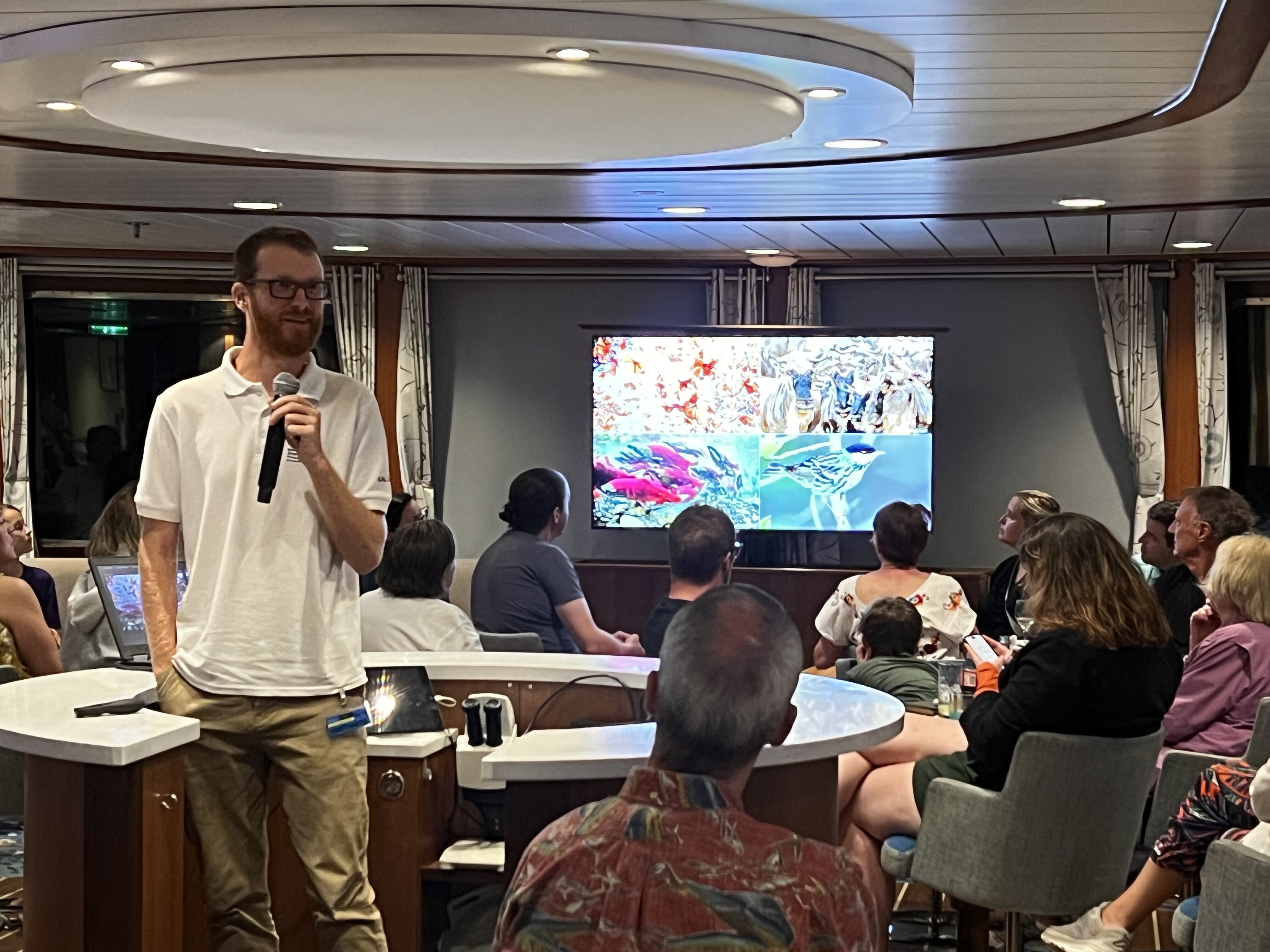 The early bird catches the worm. We were up for lots of worm catching today and the early morning activities really paid off. The Ecuadorian sun was at its mildest when we went walking and kayaking, with plenty of wildlife and beautiful scenery to see. The snorkeling at Santa Fe Bay was everybody’s favorite with plenty of fish to identify, playful sea lions cavorting, and a couple of sea turtles to keep us company. The enormous Santa Fe prickly pears are a remarkable sight, no picture can do them justice.