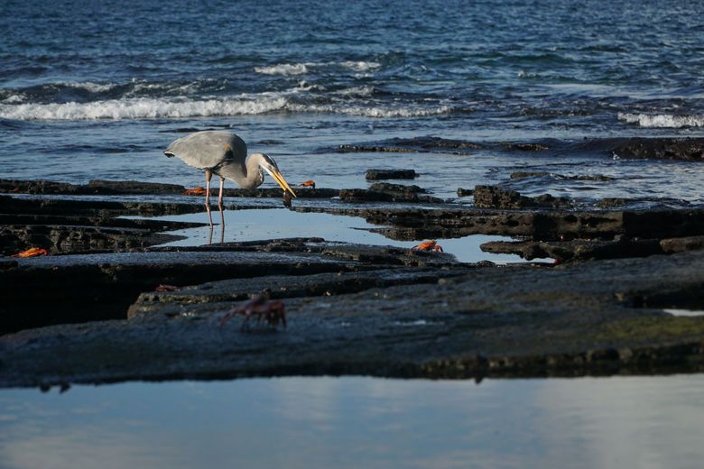 We saw also many things like lava lizards, ground finches, a yellow warbler, an American oystercatcher, a great blue heron, a semipalmated plover, and to top it off there was a Galapagos hawk perched atop a lava rock. These hawks show a very interesting mating behavior. Being a polyandria species, the female mates with several males, who will in turn provide for both her and their shared young.