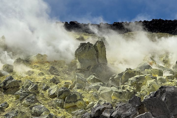 We spent the entire morning and part of the afternoon exploring Sierra Negra, specifically the sulfur mine area in the southwestern corner inside the caldera. The caldera is considered one of the largest in the world. It was an adventurous ride up the flank of the volcano in a local chiva (open-sided bus used all over Ecuador in rural areas). Then we walked, one way two kilometers, which included a descent of 320 feet, then an ascent to the sulfur fumaroles of another 200 feet. On return, we did it all again!