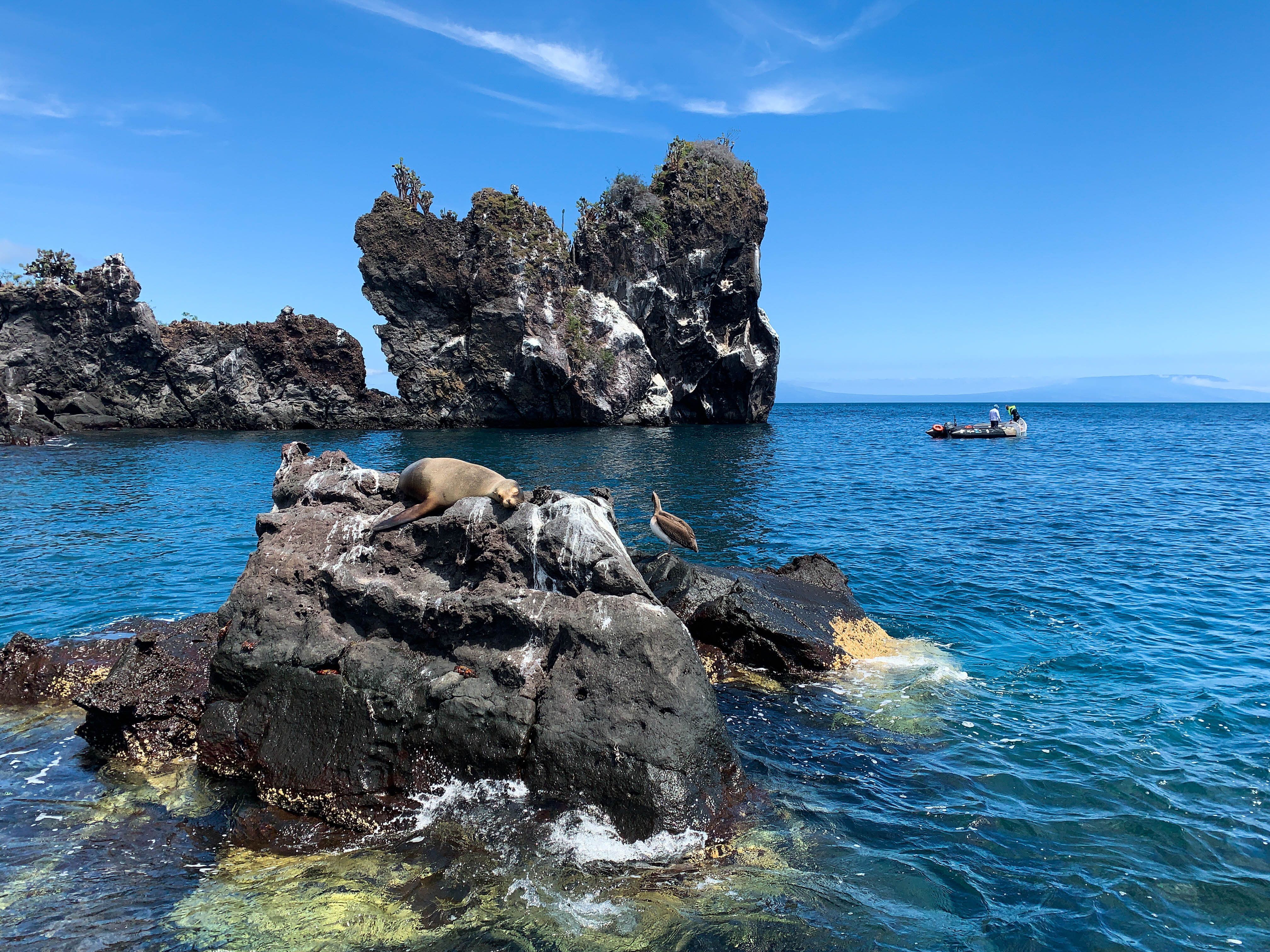 After breakfast, our agenda for the rest of the morning included deep water snorkeling and Zodiac explorations. These activities took place as we enjoyed marvelous weather with plenty of sunshine and beautiful turquoise waters. We had the company of sea lions, big schools of fish, and reef sharks.