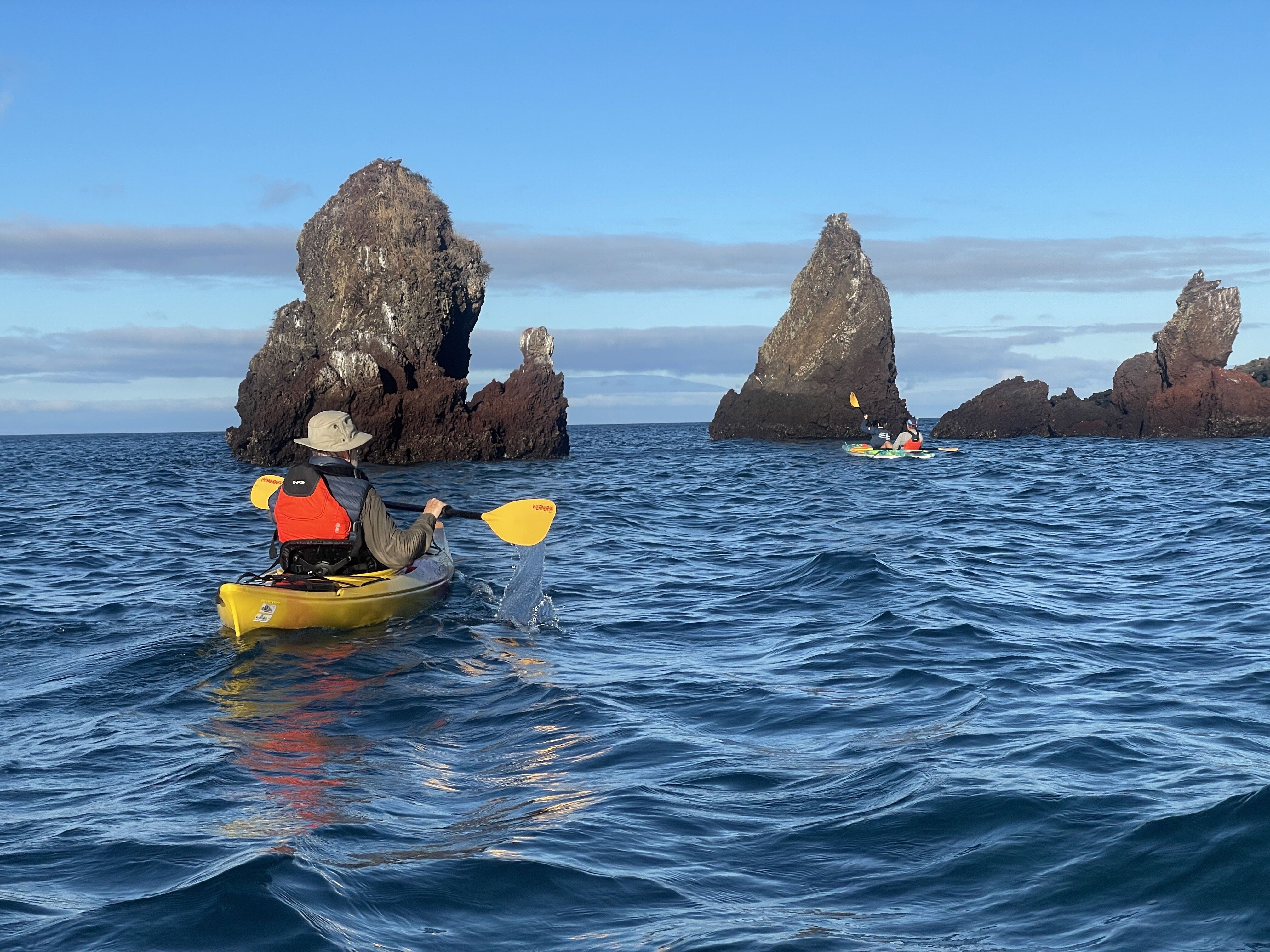Morning activities started early…before breakfast! Eager photographers visited the fine sand beach at Espumilla on Santiago Island with on-board photo instructor Anahi. A small group accompanied me on an adventurous kayak paddle along the shores of James Bay towards Buccaneer Cove. Fur seals growled and screeched from between the boulders while Galapagos sea lions accompanied us in the water–jumping alongside or in front or in back or somewhere nearby. Wet, shiny, dark brown pelts reflected flashes of sunlight which we caught in glimpses from the corners of our eyes. I expected the wind to pick up a bit as it always does after an hour or so, but it came with more power than expected! Enough that I lowered my guard and capsized in a flash. But no big deal…water temperatures are fine, and everything with me was waterproof. Everyone certainly had a good laugh at my expense! Fortunately, no one was filming…