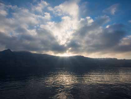 Santorini is perhaps one of the more iconic islands of the Cyclades, if not the most iconic locations to visit in all of Greece. Its picturesque, gleamingly white washed buildings and blue domed churches adorn the ridges and cliff sides, providing spectacular foreground for striking vistas. Enchanting as these superficialities are, it is its unique history, both culturally and geologically that make this location such a fascinating place to spend the day exploring. Originally called Thira, before it was named for the exiled Saint Irene, the island is shaped like a crescent moon. This is a relatively new development occurring around 1628 B.C., depending on your definition of relative, when a massive earthquake triggered a significant volcanic eruption with ash extending all the way to Egypt. This resulted in a 76 square kilometer caldera in place of where previously the majority of the ancient island had existed. Our morning begins as we sail into this impressive feature, shafts of light peak through the early morning cloud cover, glittering on the deep blue waters.