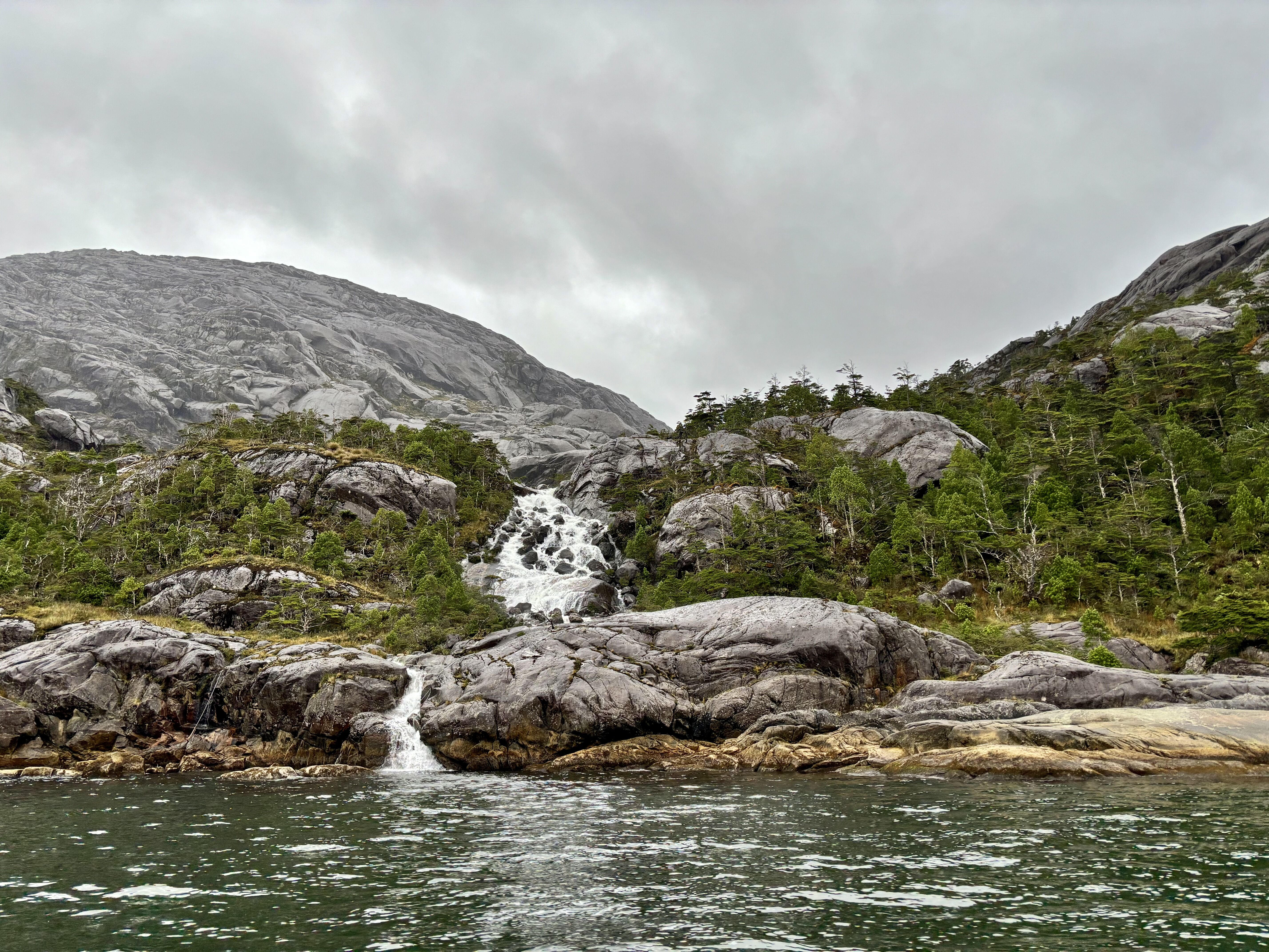 It was difficult to escape the rain at Seno Glacier, our first stop for the day. Part of the Gran Campo Nevado ice field, this glacier has receded over one kilometer since 2016, and the bare walls of the channel were proof. The Zodiac cruise was chilly but magnificent as we entered the channel that towered hundreds of feet above us. Dikes of dark mineral streaked the channel walls in long, vertical swaths against the clean surface, and small icebergs were strewn at the base of the receding glacier, giving all a sense of polar awe.