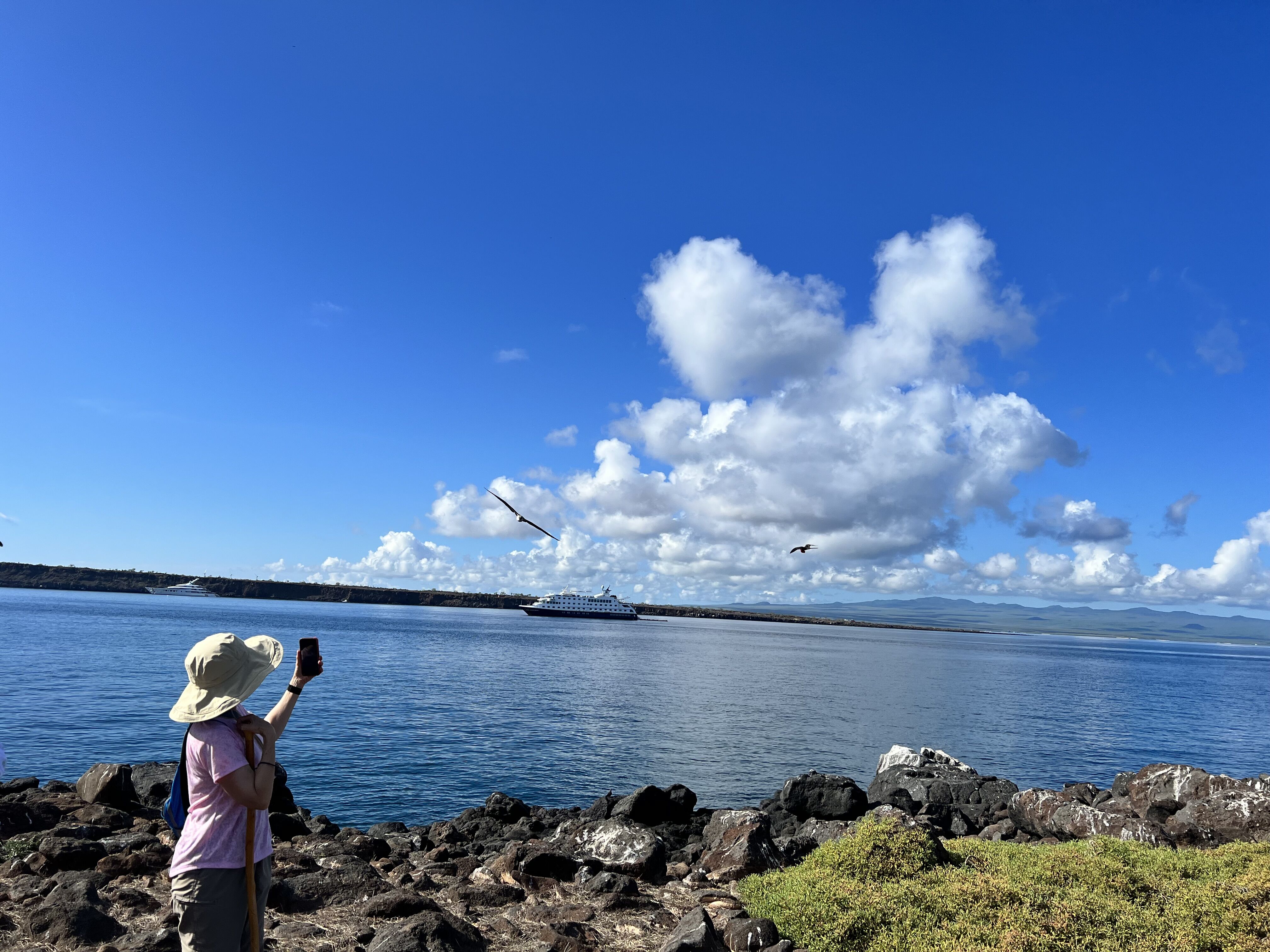 We started the day with excitement as we landed on the beautiful, pristine coast of Isla Genovesa - a true birder’s dream. Along the sandy beaches and steep cliffs of Darwin Bay, we were surrounded by an incredible array of birdlife. Frigatebirds soared closely overhead with their red pouches on full display, while Nazca and blue-footed boobies nested along the rocky ledges. Swallow-tailed gulls called out as we walked past. In the distance, we saw the stoic and elusive short-eared owl. The island was alive with color, sound, and constant movement. Between our excursions to Isla Genovesa, we snorkeled near Prince Philip’s Steps and discovered a vibrant world beneath the waves. Schools of fish swirled around us, a fur seal turned in the water as if dancing on cue, and sea lions relaxed nearby. As our last snorkeling adventure came to a close, we spotted a sea turtle resting calmly in a crevice. As the sun retreated into the sky on our last return to National Geographic Endeavor II, we reflected on the sheer magnitude of what we witnessed on our last full day. Isla Genovesa, like the other islands, gave us a connection to a sacred world. The harmony between land, sea, and sky reminded us how deeply interconnected, vital, and fragile these ecosystems are. Watching birds tend to their nests and marine life swim effortlessly, we were struck by how little space there is between wonder and reverence. We recognized that our journey wasn’t just about observing unique wildlife, it was about feeling part of something grander and beautifully ancient.