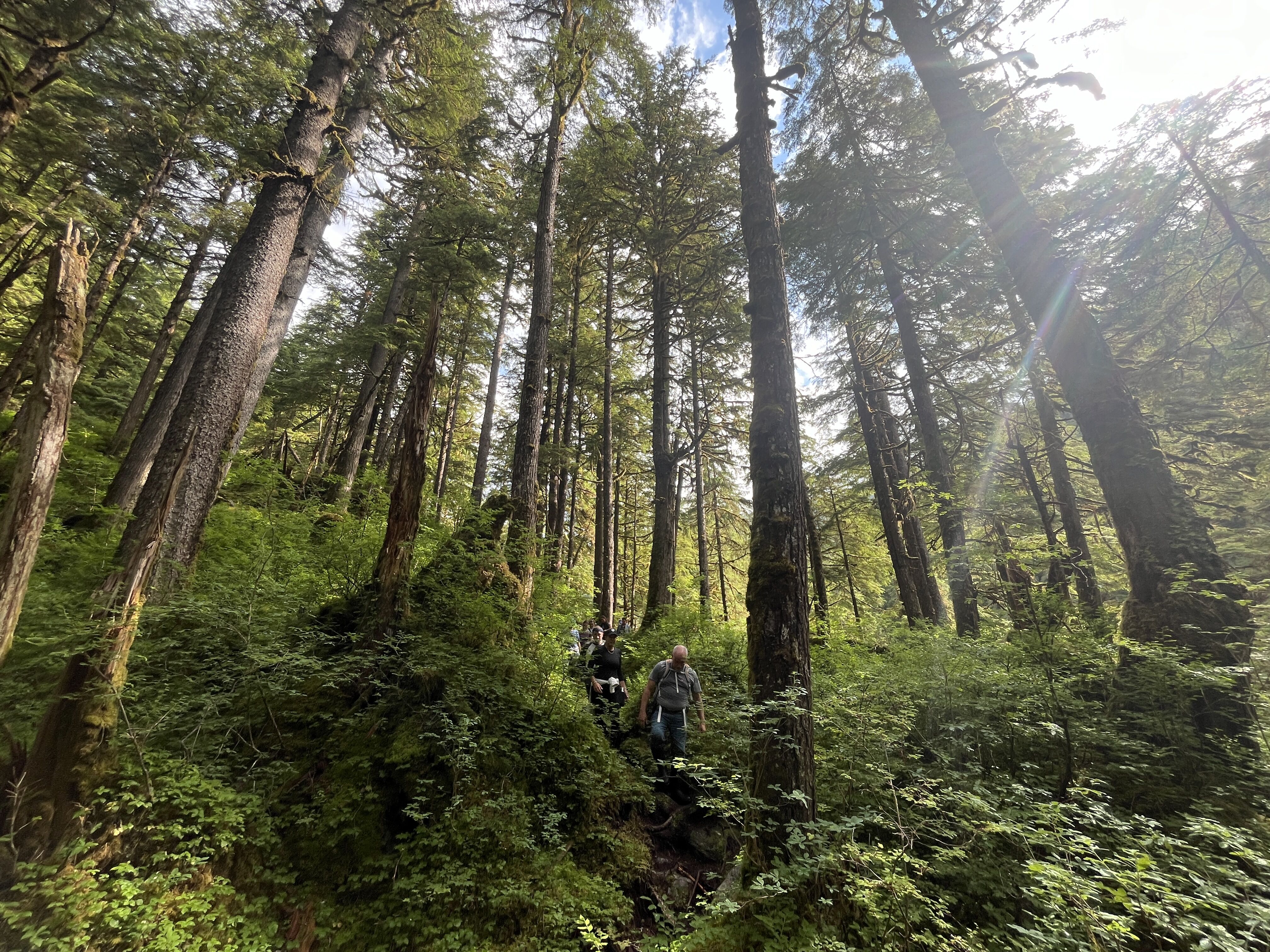 The hikers found ample evidence of recent bear presence in the form of fresh scat and tracks, but no bears were to be found. Most of us were quite relieved not to surprise a bear! The Zodiac cruisers were treated to gorgeous intertidal habitats littered with mussels, barnacles, sea stars, and clams. After warming up a bit at lunch, a record thirty-one brave souls jumped into the frigid waters for our polar plunge! As we arrived in Sitka this evening, we admired the snow-capped mountain tops normally shrouded in mist. Steller sea lions cavorting around the dock served as reminders of our adventures.