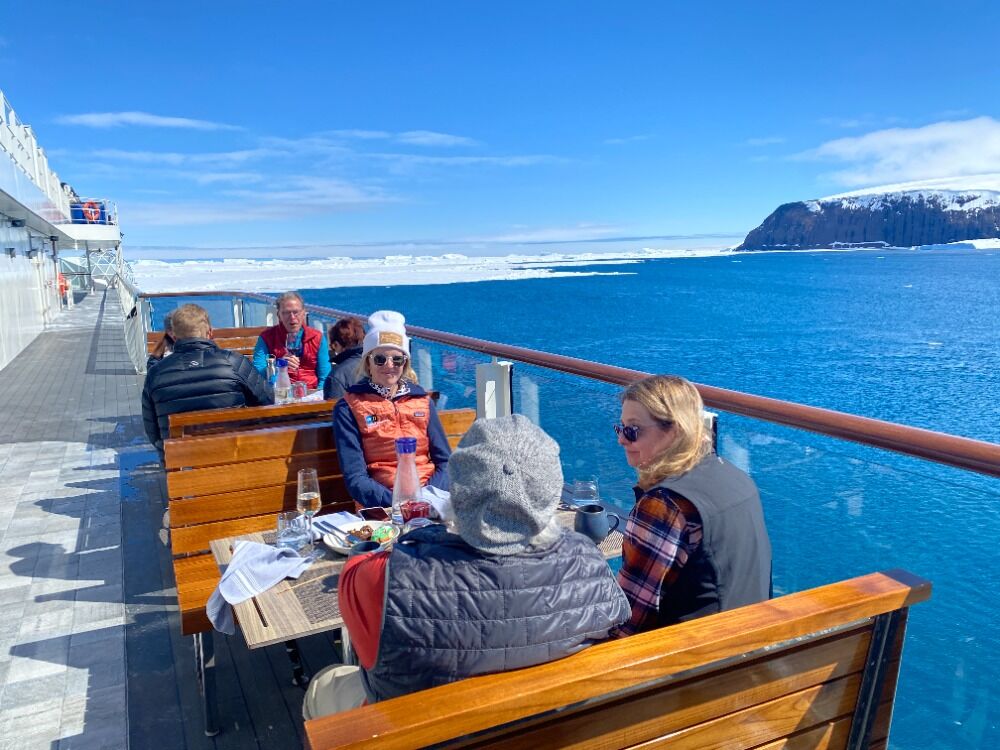 We were surrounded by ice the entire day, and our operations allowed us to get deep within the landscape. Kayakers and Zodiac cruisers alike were able to explore the icy waters as the sun slowly burned off the low clouds. Our hotel department welcomed us back to the ship with a barbecue. Many guests chose to eat outside with incredible views from the upper decks of National Geographic Resolution.