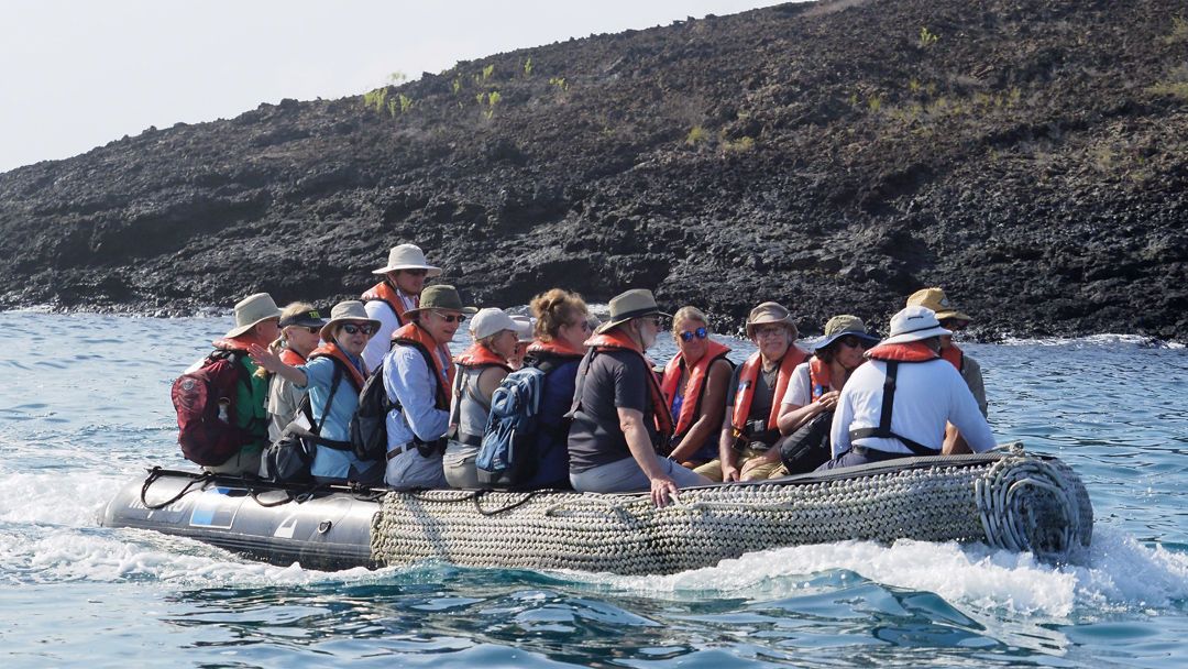 Back on board, we had lunch as we traveled to our next destination. Soon after lunch, we were given a talk about Charles Darwin, a young naturalist who visited the Galapagos in 1835, and changed the world forever! We anchored, and soon after a Zodiac ride took us to Sullivan Bay at James Island. Here, we had a one-and-a-half-mile long hike over lava flows, frozen in time as liquid rock solidified long ago. Another Zodiac took us to a nearby beach where we snorkeled and rested either on a towel or right on the soft white sandy beach.