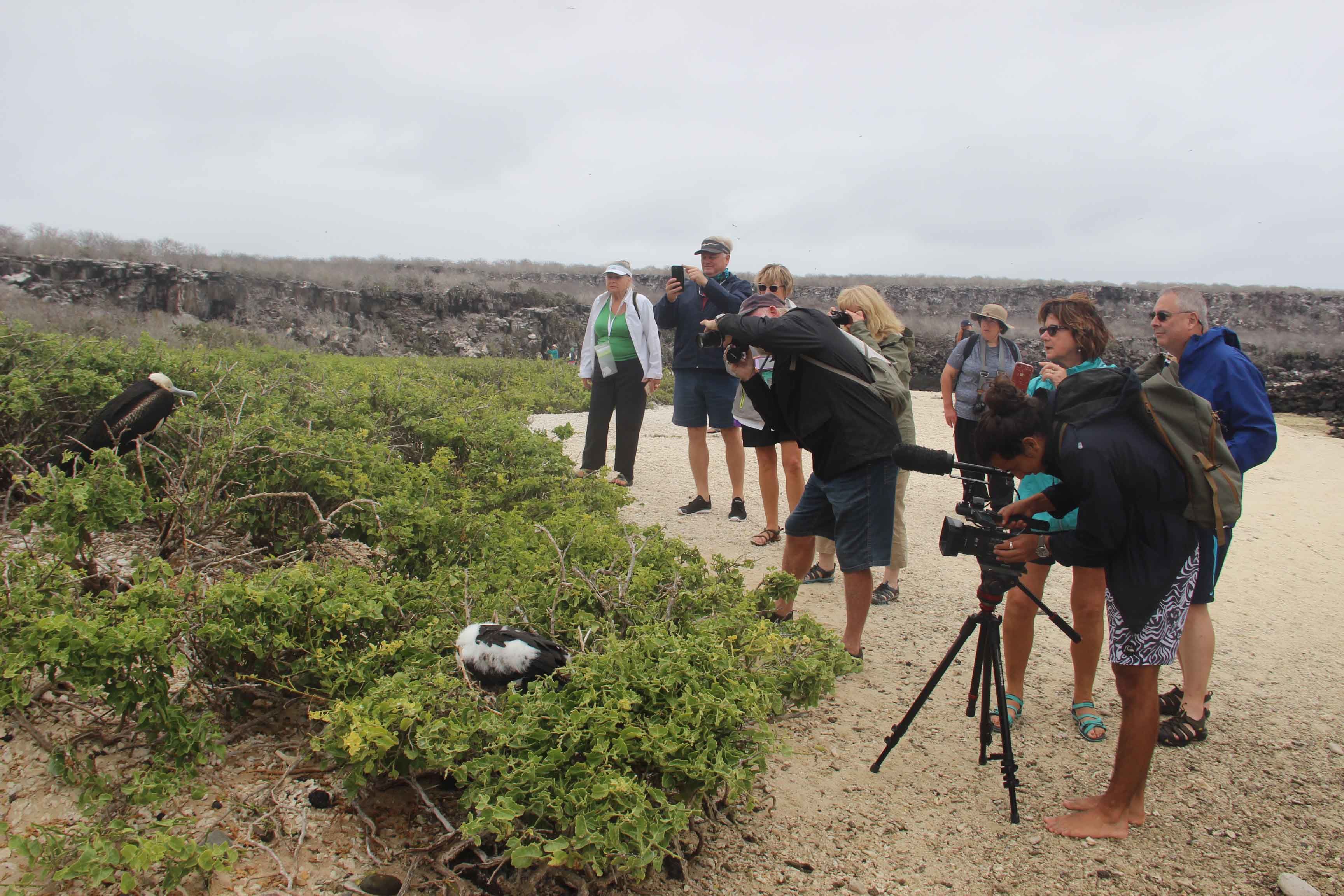 Relatively small and low compared to neighboring Santa Cruz, North Seymour is located to the north of Baltra. The island is dry with predominantly low shrubs, like prickly pear cacti. The incense trees are bare during the dry season. Seabirds like frigatebirds and blue-footed boobies nest on the island, and sea lions rest on the sand when they are not fishing. Land and marine iguanas also live here. Rabida is in the middle of the archipelago and has a striking red sand beach. We observed a small colony of sea lions of all ages resting or nursing. Behind the beach, American flamingos nest in a brackish lagoon. This island is full of contrasts and wildlife that we enjoyed observing during this day of expedition.