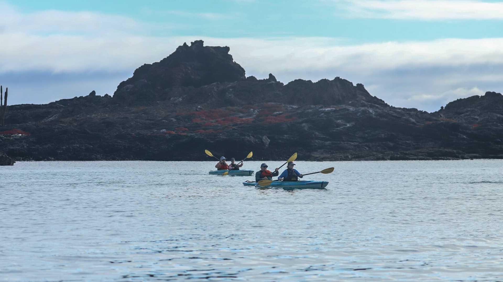 We are halfway through our expedition in the Galápagos Islands. Today, we explored Sombrero Chino and Santiago Island before breakfast. We began our first kayaking around the peaceful turquoise waters that separate Chinese Hat from Santiago Island. During marine activities later in the morning, we encountered penguins feeding on small fish, blue-footed boobies, sea lions, and pelicans along the shores.