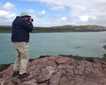 Meanwhile, Jonathan took a group along the shore and across the rocky terrain to find a hawk, lava lizards and sea lions. On the beach we went swimming beside a big and thankfully nonchalant male sea lion. The water was clear and warm and a couple young sea lions joined us for a swim! But the best thing that happened was when a penguin zipped back and forth several times in the very shallow waters beside the beach! That was a big thrill for all of us!
