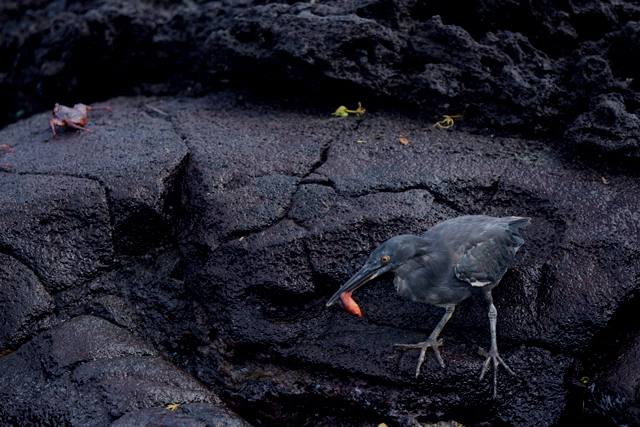 We ate a hearty breakfast and then went out to explore along the reddish coast of Sombrero Chino islet and the black coast of Santiago. We explored by Zodiac or paddled on paddle boards and kayaks. There were a couple of shy penguins that a few of us spotted; then they splashed into the water and dove out of sight. We photographed and admired striated herons fishing and chasing crabs along the tideline and saw noddy terns, brown penguins and Galapagos shearwaters. There were a few marine iguanas well camouflaged on the dark lava shores. The kayakers paddled all the way around Sombrero Chino and what a lovely sunny day it was!