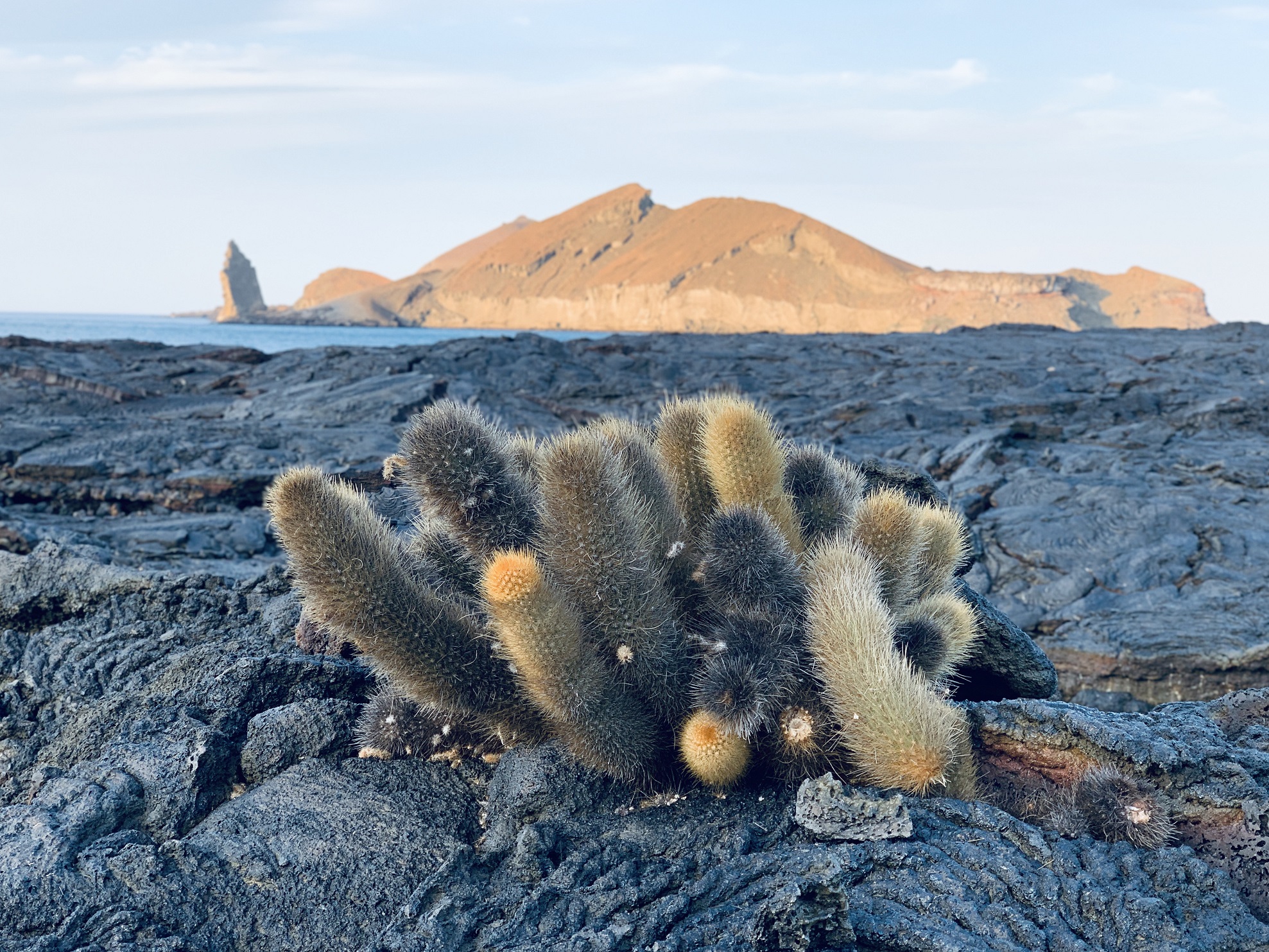 Early in the morning National Geographic Islander drops anchors in the turquoise waters near Bainbridge Islands around the corner of Sombrero Chino, an eroded spatter cone formed hundreds of thousands of years ago by a side vent of James Island.