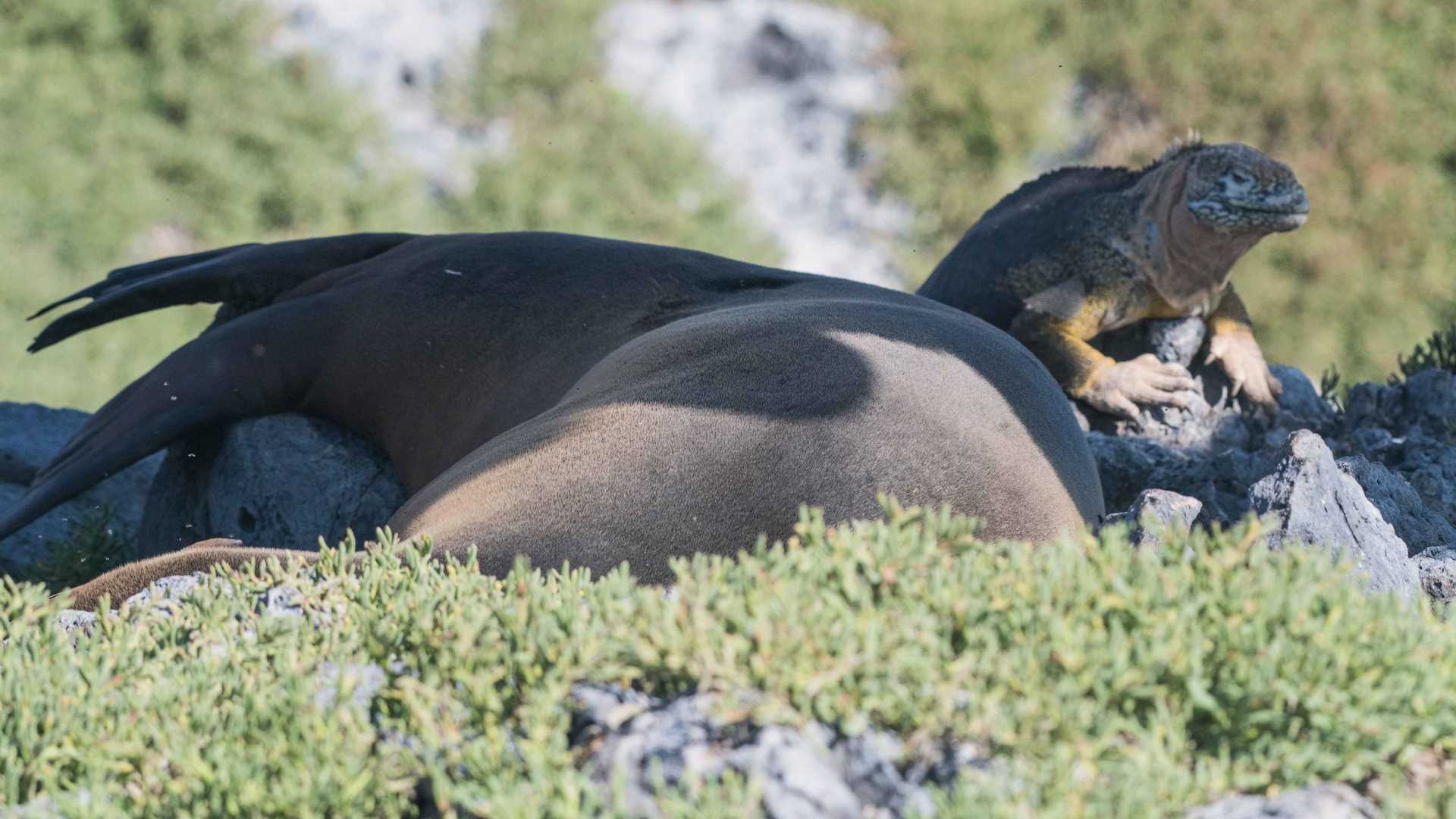 Those on the short-trail option disembarked on the small beach with a hundred sea lions that were fighting and resting, nursing and playing. We found several Santa Fe land iguanas on the short trail, too! We have had a marvelous day in Las Islas Encantadas!