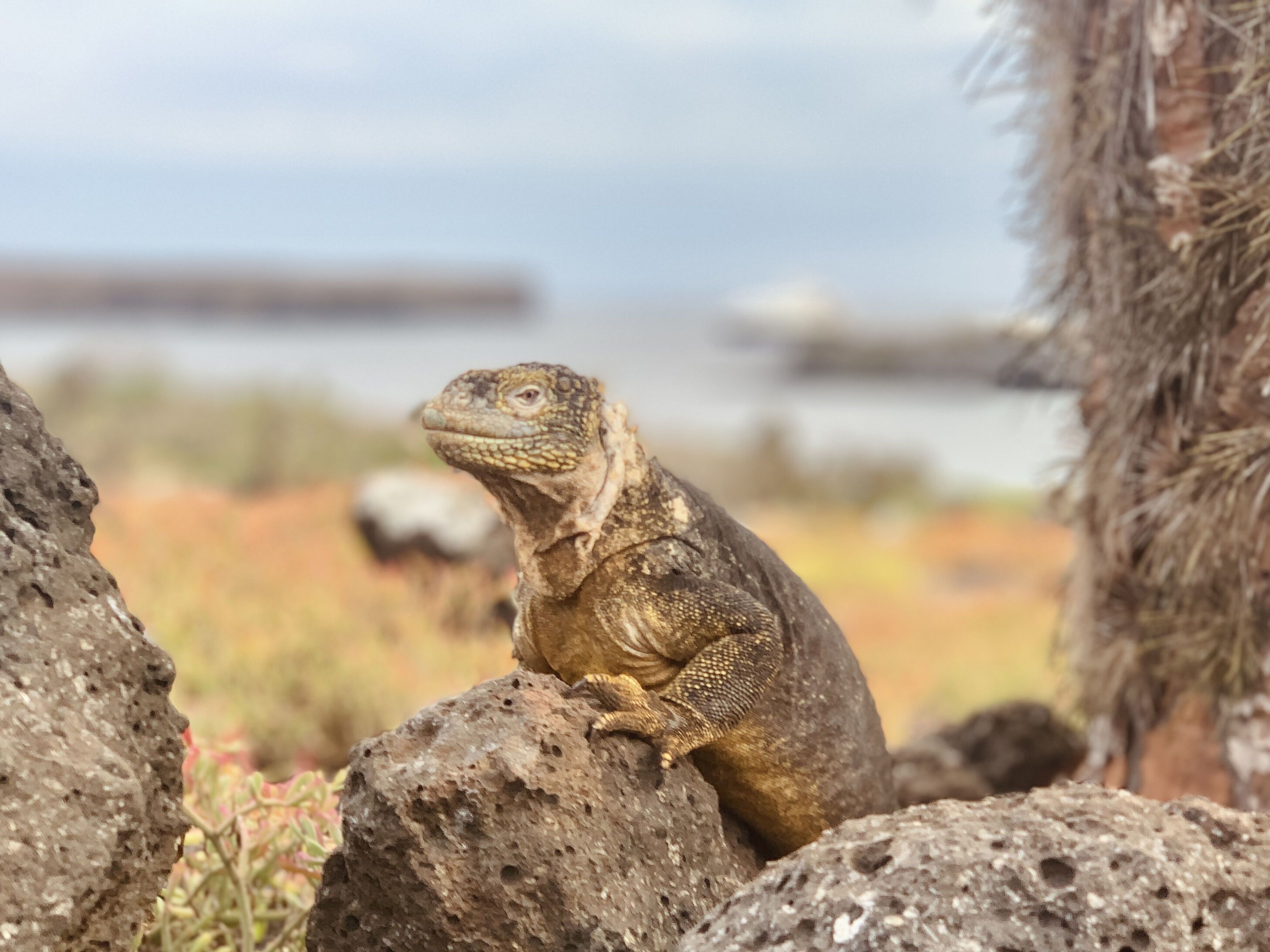 South Plaza Island is home to several iconic species of Galápagos fauna, including Galápagos land iguanas, swallow-tailed gulls, and Galápagos sea lions. One of the most prominent species we encountered on the island was the Galápagos land iguana. These reptiles are endemic to the Galápagos Islands and during the dry season primarily feed on cactus pads and prickly pears. At this time of the year the island is green, and the iguanas were feeding on yellow flowers. We also observed them basking in the sun to regulate their body temperature, a common behavior among reptiles.