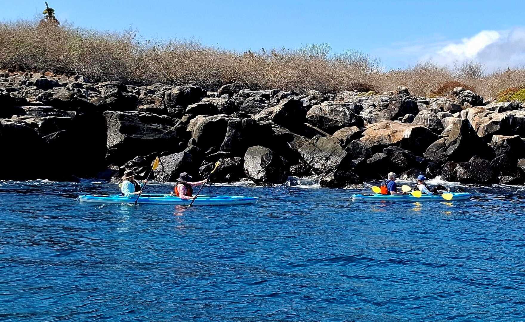 The hot season begs for an early morning start, in order to avoid the crushing heat of midday at the Equator. The first activity on today’s agenda was kayaking around North Plaza Island, followed by breakfast. Afterward we enjoyed a land walk at South Plaza Island where sea lions, yellow land iguanas, prickly pears, red sesuvium bushes, and swallow-tailed gulls combine to perfection. After departure and while motoring to our next destination, National Geographic Islander II was surrounded by hundreds of bottlenose and common dolphins.