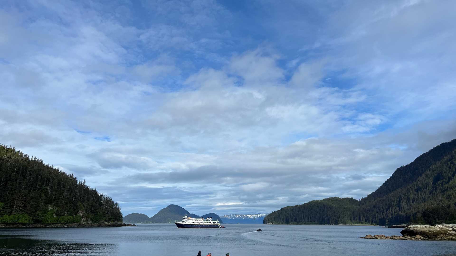 Along the remote, northwestern edge of Southeast Alaska, our expedition took us on a journey to the mystical Salt Chuck Bay. We embarked on a day of exploration into the forests and up a hill to a remote muskeg, where shore pines sat in an open, mossy clearing. Since it was low tide, we ventured across the intertidal zone which revealed its secrets, unveiling a hidden world teeming with vibrant marine life. But our adventure didn't stop there. Guided by the call of adventure, we glided through the pristine waters of Salt Chuck Bay, our kayaks silently slicing through the mirrored surface. After lunch, we boarded Zodiacs to venture closer to the shorelines of this archipelago. Within a few minutes, amidst the grandeur of nature, we were greeted by an unforgettable sight – humpback whales feeding and diving against the backdrop of rugged cliffs and breaking waves. Steller sea lions basked lazily on rocky outcrops and hunted for fish in the pass as the current ripped and whirled underneath our boat. “I have no words,” proclaimed someone in our Zodiac. The unyielding beauty and enchantment that can be found within the heart of Alaska's untamed wilderness were in full force today.