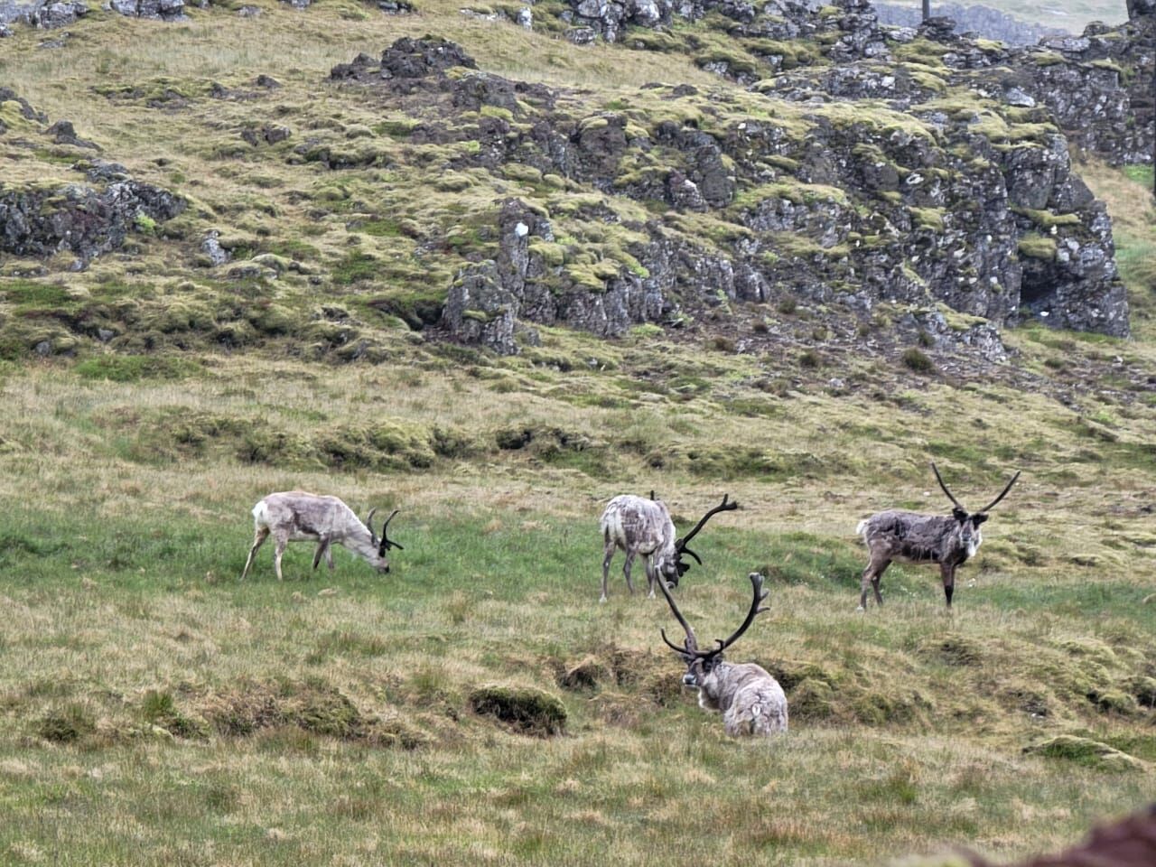 The walkers toiled up a steep slope along a rough farm track on this rocky and mountainous island. They were then able to enjoy the expansive, lush tundra landscape with tiny pools and even patches of low birch and willow “forest” here and there in sheltered ground.