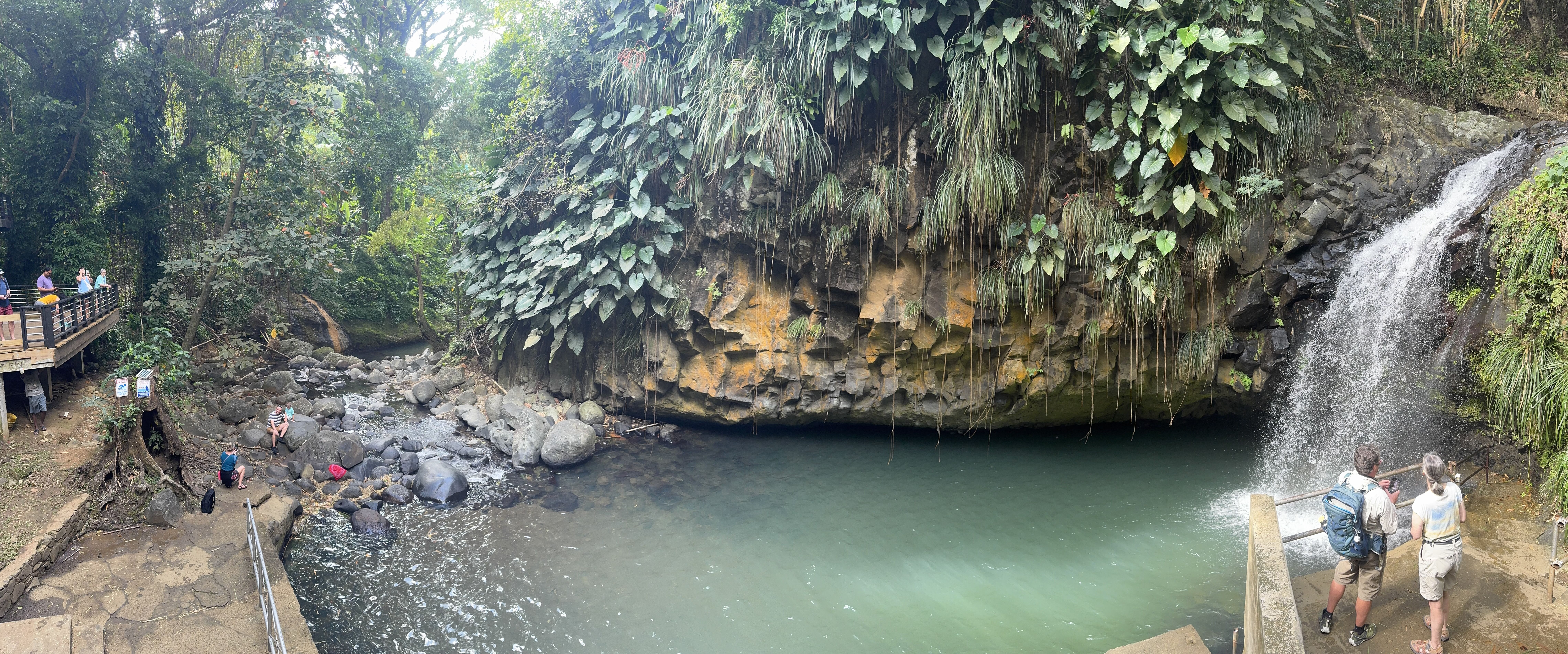 On first entering the interior of the caldera the sulphur smell was quite strong—hot gasses, molten waters, mud, and rock bubbled and explosively broke the surface of the lava pools. The hydrogen-sulfide gas leaves a strong smell in the air, and for the very first time the seismic activity, which created these Lesser Antilles was evident to all of us. All of the islands which we will visit—with the single exception of Barbado—are the product of this volcanic activity. Today still Dominica has nine active volcanoes. Our volcano guide Michelle was well-versed in the geology and took us to an overlook where we could look into the face of the bubbling and sulphurus mud as it hissed and exploded.