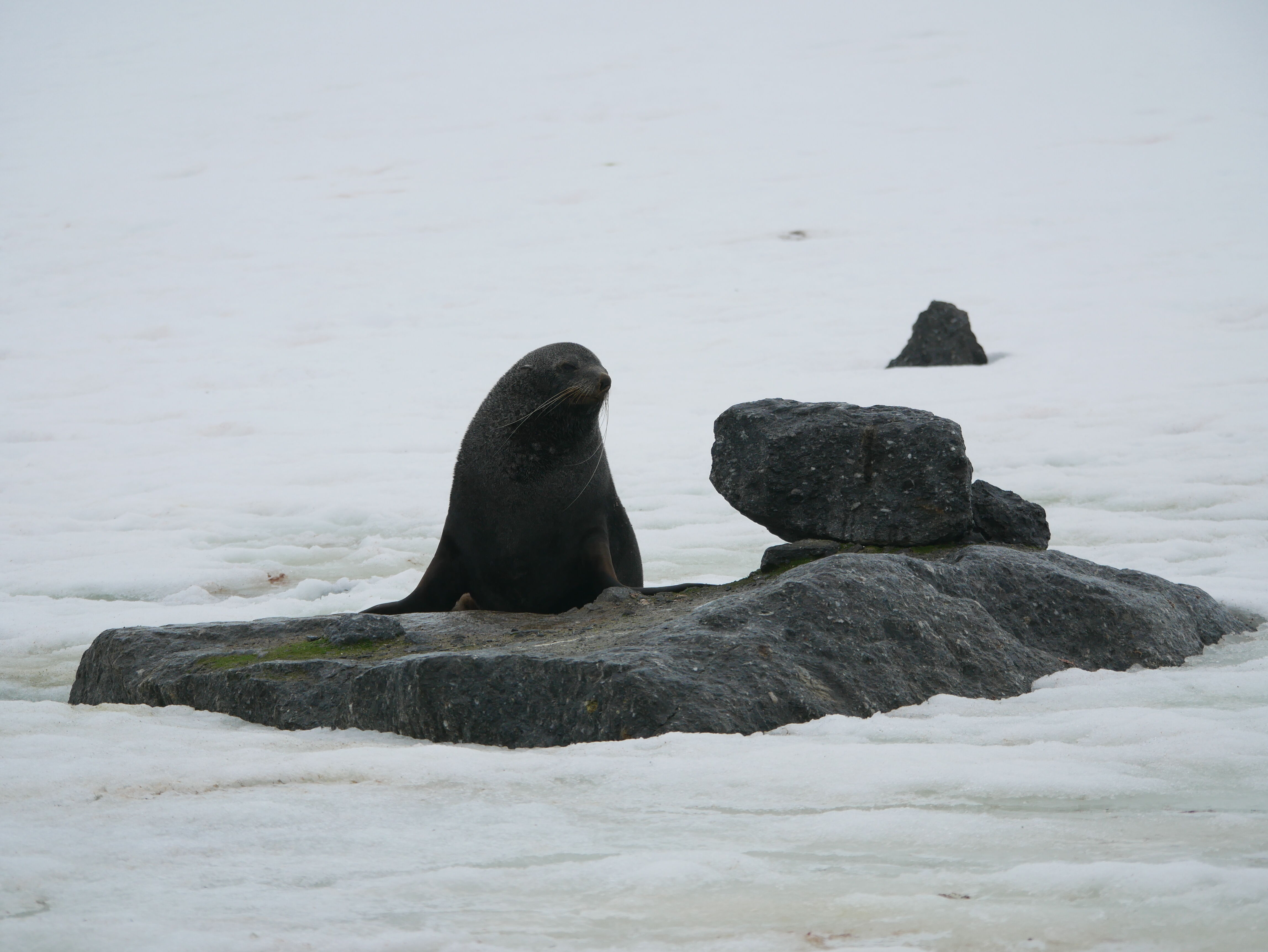 We worked our way down the descent over ice banks and following the switchback path of rocks along a waterfall and next to a stream. We continued to weave our way closer to the shore avoiding “land mines” of fur seals guarding their territory. We met up with the medium and short distance hikers and layered our clothing back on as we boarded the Zodiacs for our next adventure.