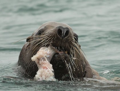Captain Leif Skog, an excellent observer, first noticed an ivory gull. These birds are often associated with polar bears that have made a seal kill on the ice. On cue, Eric our polar bear finder, searched and located a male laying on a large piece of ice. As the ship approached slowly the bridge and bow once again filled with eager guests. The bear appeared to be laying on something covered with snow, and as we approached more and more glaucous and ivory gulls landed around the resting bear in search of a meal. With the ship stopped we all watched the bear as it rested then decided to unbury the ringed seal it was laying on.