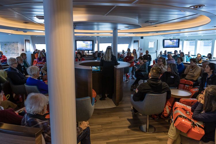 On the last full day of our voyage, we woke in Endicott Arm near the Dawes Glacier. We spent the morning enjoying Zodiac tours to the face of Dawes Glacier and watched multiple calving events. We were also able to spot several harbor seals, waterfalls, and a couple harbor porpoises on the way. After lunch we had the opportunity to participate in a polar plunge. Forty people decided to brave the frigid water for a short swim. Those of us not eager to jump into glacier water were able to watch from the bow. After the polar plunge, we warmed up on board as we started transiting towards Juneau. On the way, we stopped at a beautiful waterfall to once again admire the amazing natural beauty of Alaska. During our farewell recap, we were treated to a quick visit by a humpback whale. We ended our day with a slideshow made up of our favorite photos and memories of an amazing week on board National Geographic Quest .