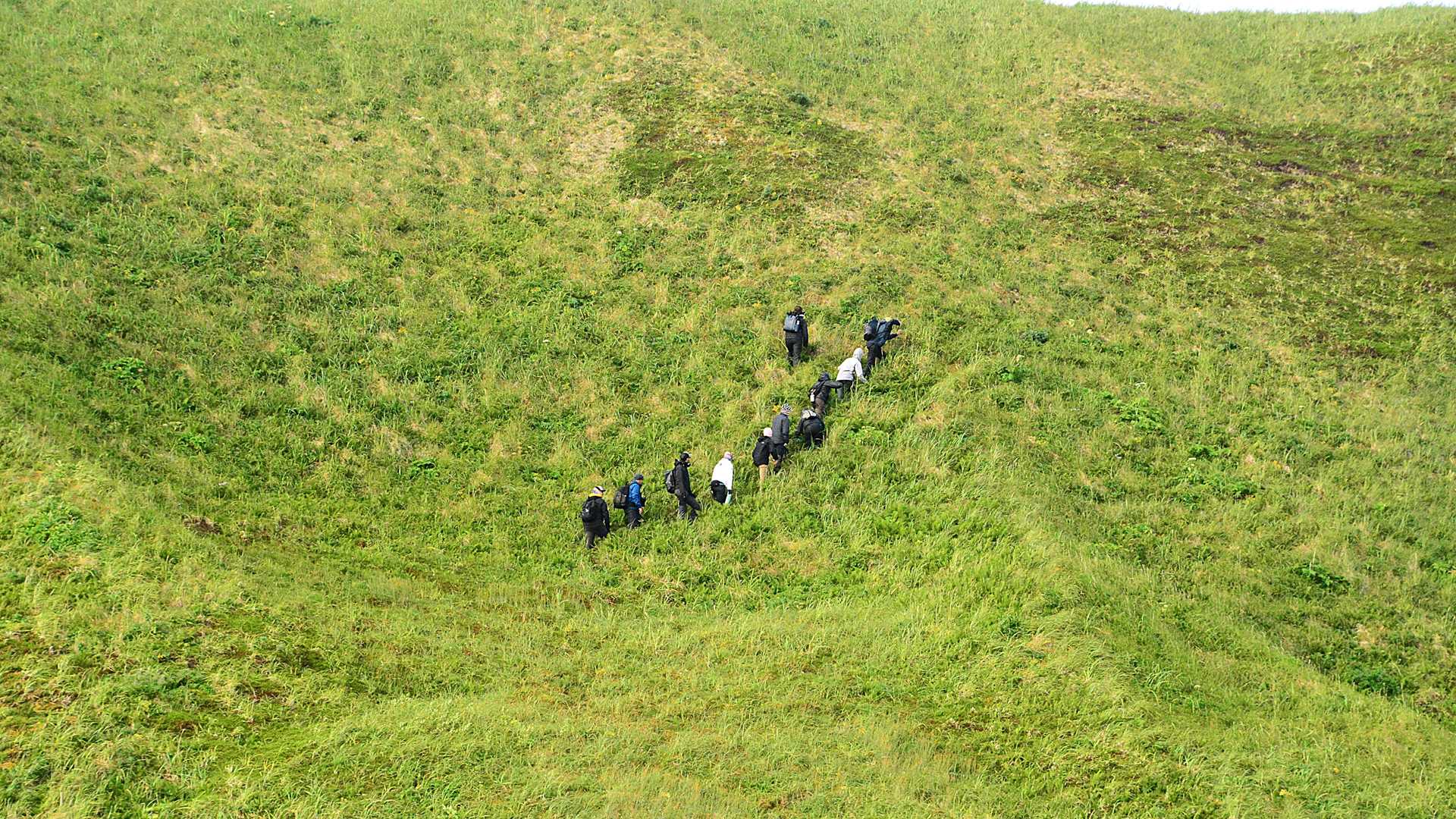 Our expedition landing this morning was in Tanaga Bay, on the southwest side of irregularly-shaped Tanaga Island. There were opportunities for a strenuous hike up a steep ridge and beyond, as well as exploration along the beautiful black sand beach. Many interesting curiosities were found during low tide along the expansive sandy shore, providing a variety of ways to use our imaginations and test and improve our photo skills. Glimpses of Tanaga volcano enhanced the backdrop and dense tundra vegetation covered the landscape above the high tide line. Birds observed included bald eagles, fox sparrows, black oystercatchers, and glaucous-winged gulls.