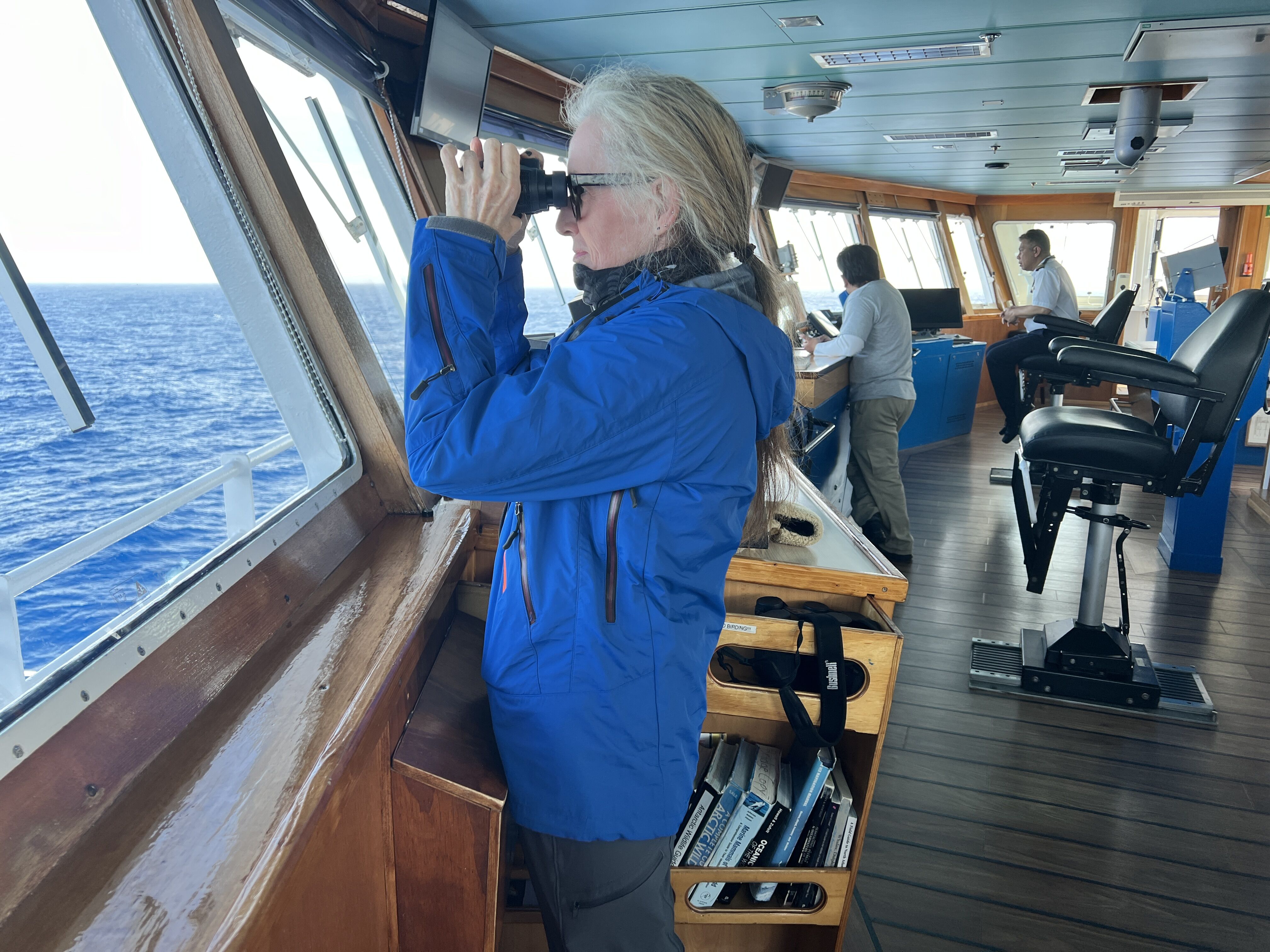 I popped up to the bridge several times during the day to monitor our surface sea temperatures. The water temperature dropped very abruptly at 3 pm, from well over 39°F to 34°F, indicating that we had just crossed the Antarctic Convergence.
