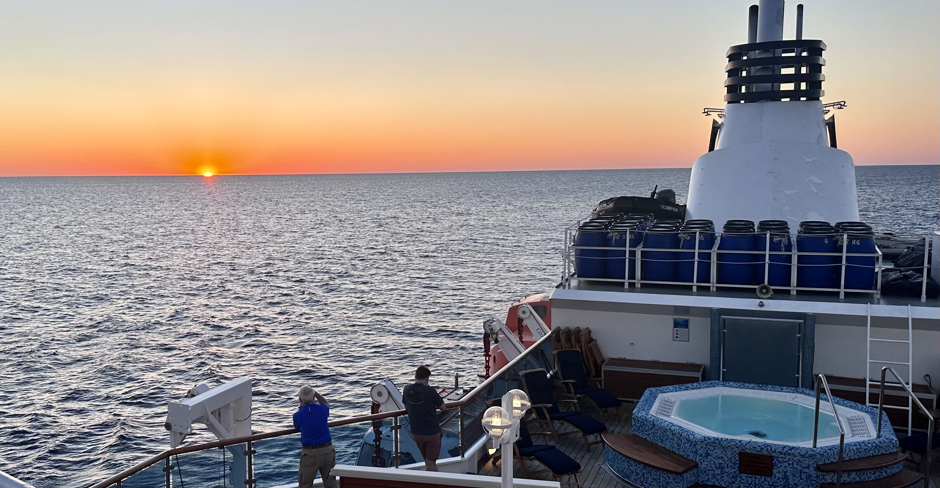 The morning began with wellness stretches hosted by Belinda on the sundeck. Guests enjoyed watching the sunrise whilst spotting the occasional passing whale. After another delicious breakfast in the outdoor café, undersea specialist Adam delivered his presentation, “Avian Physiology and Behavioural Adaptations.” This presentation was partially postponed by a collection of whales engaged in a mating display in close proximity to the ship. Guests were treated to a rare encounter that included one female and several pursuing male humpbacks. Lots of tail, fin, and chin slapping could be seen and heard as the whales twisted and turned over one another in fierce competition. After lunch, we dropped the pick adjacent to the Lacepede Islands. Passengers enjoyed the sheltered waters the sand cays provided whilst cruising in the turquoise bay and looking for wildlife. The ever-present population of brown boobies was the centerpiece, complemented by the frigates, crested terns, oystercatchers, pelicans, and red-capped plovers to name a few. The sea snake guests spotted alongside the boat as we departed was a rare treat. Once inside the lagoon, the resident crocodile posed politely for some great photos. The clear, shallow waters offered guests the chance to observe a myriad of green sea turtles, shovelnose sharks, and cowtail rays. Back on board, guests indulged in a cocktail hour hosted by Captain Alex, who delivered a sincere farewell on behalf of all crew before we retired to the dining room one last time.