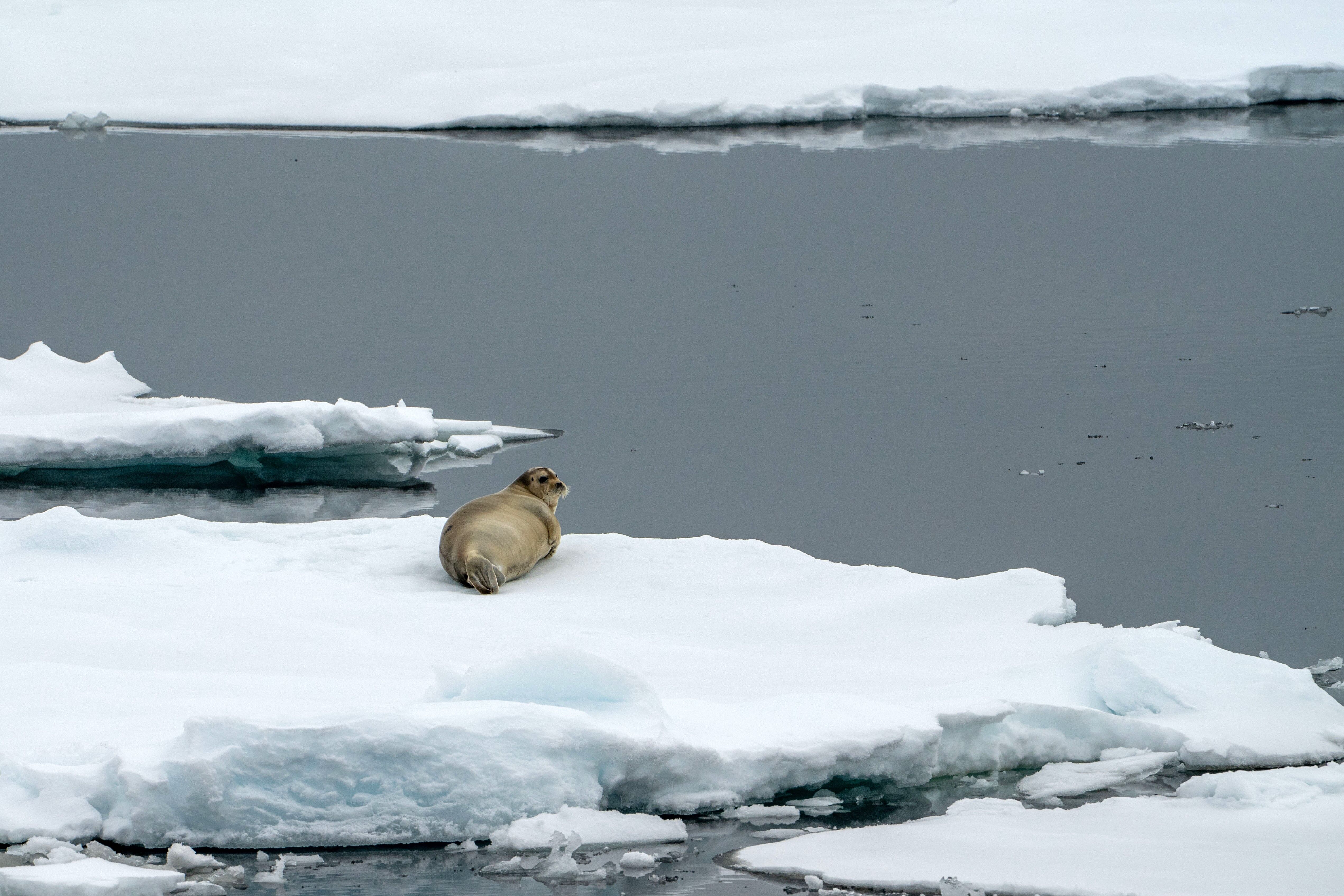 In the morning, guests enjoyed kayaking in calm water near the Wahlenberg Fjord of the Northeast Island. Nearby, a walrus fed at the bottom, surfacing every few minutes to catch a breath before diving again.
