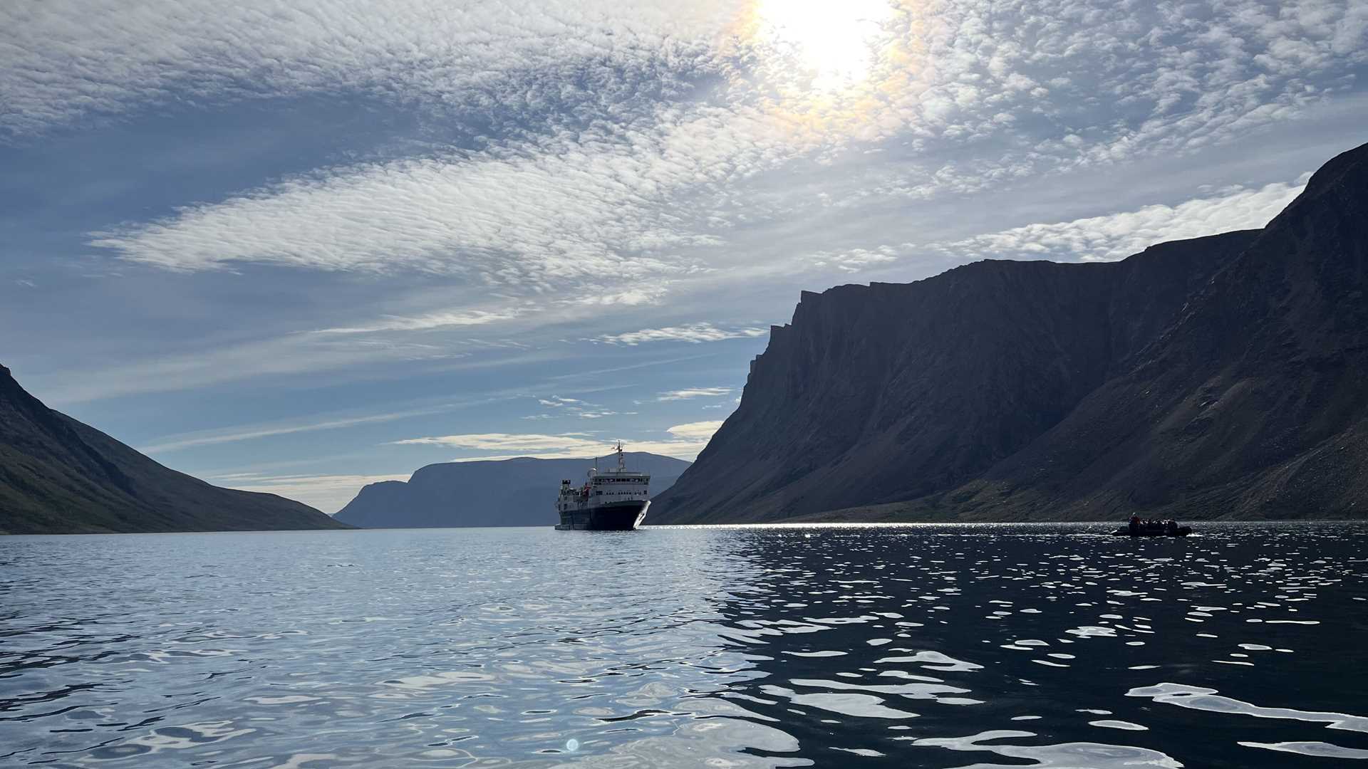 As National Geographic Explorer entered the Saglek Fjord this early morning, people slowly awoke. This morning the sun was shining through the windows and the blank fjord gave reflective images of the majestic mountains rising on each side.