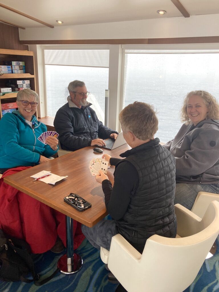 Can the weather get any better? March is mid-fall here, equivalent to October back home. It was still dark when we boarded buses for our full-day tour of southern Chile’s iconic Torres del Paine National Park. We drove north. A rosy glow at the skyline slowly transformed into golden light, casting slanted shadows as the sun rose over the hills to the east, illuminating the mountains in front of us. Some of us were on the panoramic tour, visiting key scenic lookouts and finishing at Rio Serrano for a traditional Patagonian asado, or barbecue. Whole lambs had been roasting over lenga wood fires all morning. The rest of us were on a slightly longer tour, with two lovely hikes breaking up the bus ride. (We still enjoyed the lamb barbecue!) We were blessed with blue skies, sunshine, and no wind, which is very unusual for southern Patagonia. Well, that is, until our second hike, up a high hill called Cerro Condor, where the wind was so strong that it was hard to walk…at times, even to stand! After our delicious barbecue, we headed back to National Geographic Explorer , where it was docked at Puerto Natales, ready to continue our adventure.