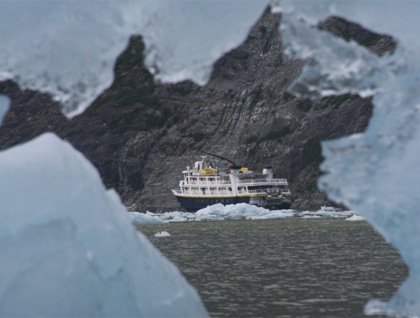 After sunset the National Geographic Sea Lion continued her passage north into Frederick Sound and then into Stephens Passage. At 4:30 this morning the Sea Lion crossed the terminal moraine of Sawyer Glacier located in Holkham Bay, which marks the entrance of the spectacular and majestic Tracy Arm-Fords Terror Wilderness area. Several thousand years ago a glacial sheet of ice carved these two fjords. When the ice retreated, approximately twelve thousand years ago, salt water filled the deep channels, creating a path of extraordinary scenery which leads to the face of a glacier that has receded into two faces. For the next twenty-three miles the Sea Lion kept a steady pace, making her way around corner after corner heading for our morning anchorage just off of the face of South Sawyer Glacier.