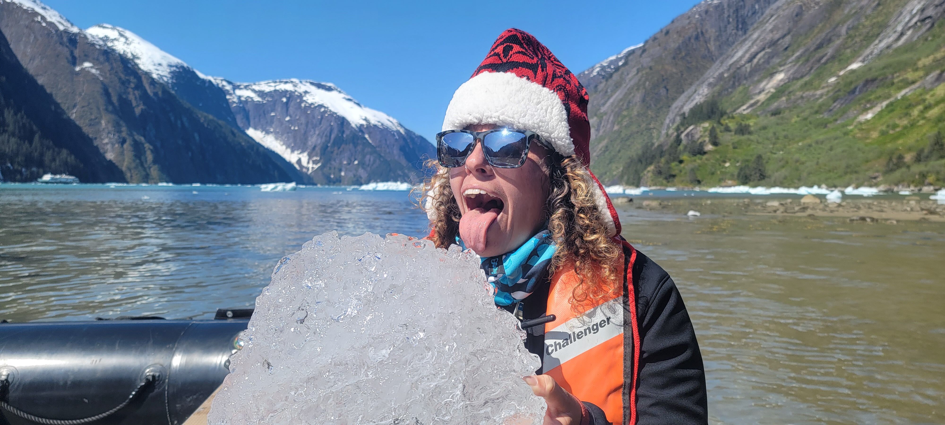It feels as though our entire journey north has been leading up to us witnessing a glacier in all her glory. We’ve been learning to notice the signs of glaciers as we admire the stunning wilderness in the fjords we transit. We went up Tracy Arm today in hopes of seeing an active tidewater glacier. As we made our way farther and farther into the fjord, it became apparent that National Geographic Quest was completely surrounded. There was ice everywhere and of every size. Some pieces were small enough for a cocktail, and others were as large as skyscrapers. We embraced the ice and spent our morning cruising around the beautiful sculptures. Many intrepid explorers made a landing on the beach and even got a taste of some of the ancient ice. It seems the glacier was intent on giving us only a tease at her might, so we will rally north to Glacier Bay National Park in search of a closer look at a tidewater glacier tomorrow. Oh…and some very brave souls took the opportunity to polar plunge in the fjord!
