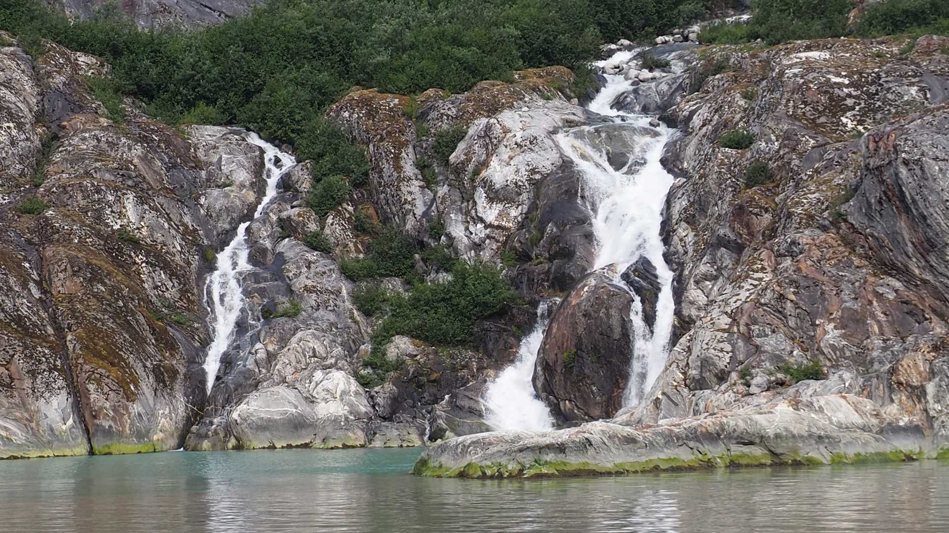 We brought National Geographic Venture up to the Sawyer Glacier (which is no longer a tidewater glacier), and enjoyed sunshine and blue skies. Streaming waterfalls cascaded off the surrounding cliff faces.