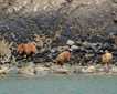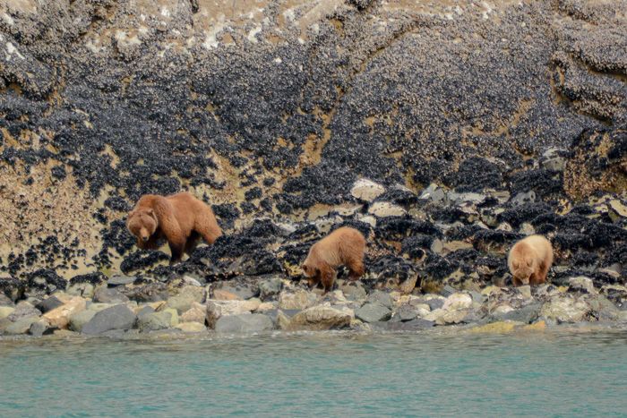 Bears have only recently left their winter dens and are busy foraging. The upper intertidal zone is one of the best food resources in spring, and the two bears we spotted were intently scraping up mussels and barnacles. Both of the bears were black bears, though their coloration varied. Black bears may be black, cinnamon, white, or even blue—glacier bears—so color isn’t a very good indication of species. Brown bears, also known as grizzlies, have a hump of muscle above their shoulders and a dished face. The absence of that hump and the straight nose on these bears were the easiest characteristics to distinguish.