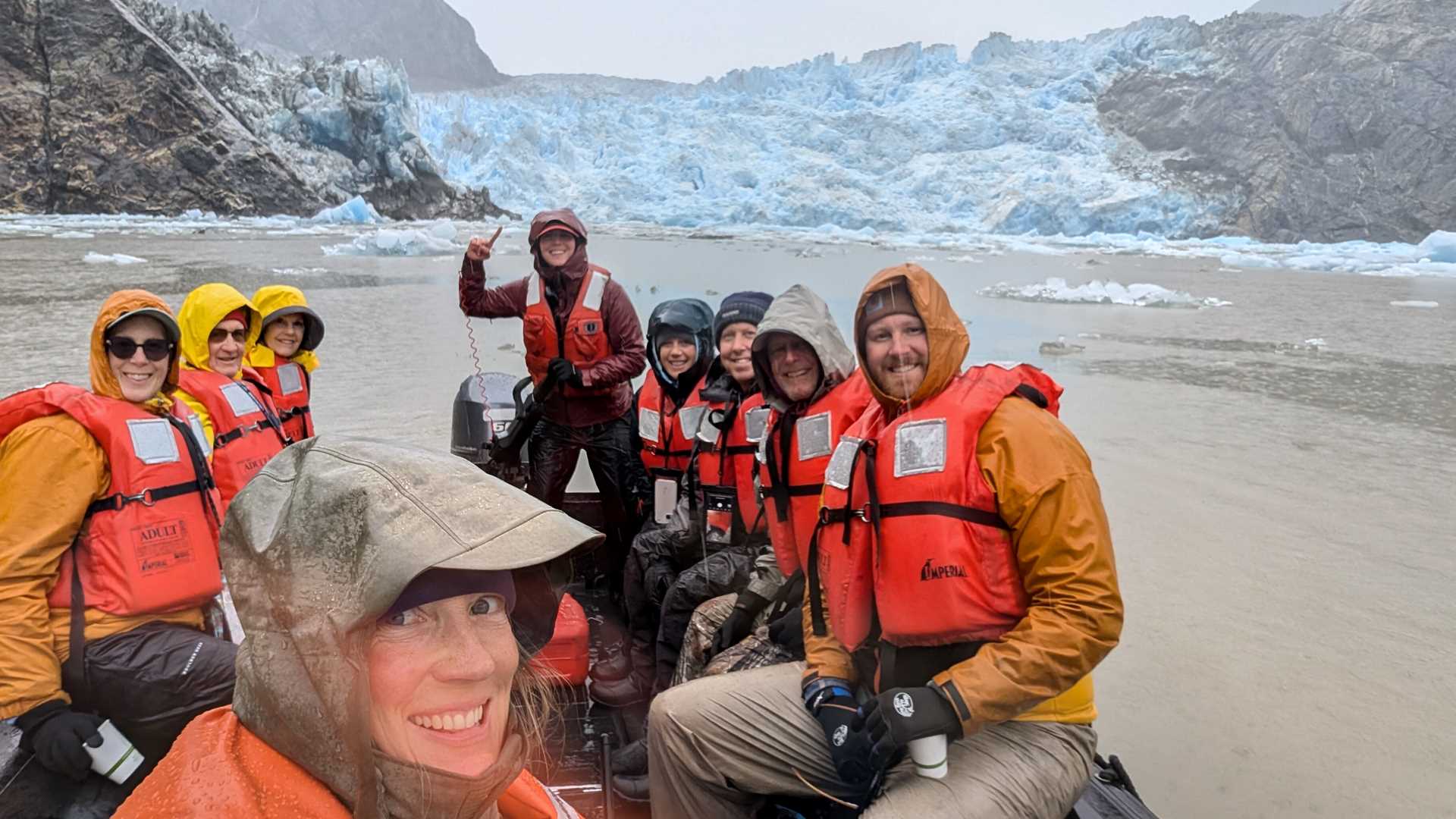 The rain that was forecast and promised for the whole trip finally found us today. But it did not dampen spirits — everyone was keen to get out in the Zodiacs for an up-close-and-personal experience with glacial ice and the surrounding environment. One amazing perk of the skies opening up on us was the enlivening of the mountains by an amazing abundance of waterfalls. They came in all forms — from trickles and slivers of white, to raging muddy torrents creating their own clouds of mist as they hit the fjord’s waterline. It certainly was an atmospheric morning afloat in front of South Sawyer Glacier, and the arrival of the hotel boat peddling its hot and spiked beverages was cheered by everyone.