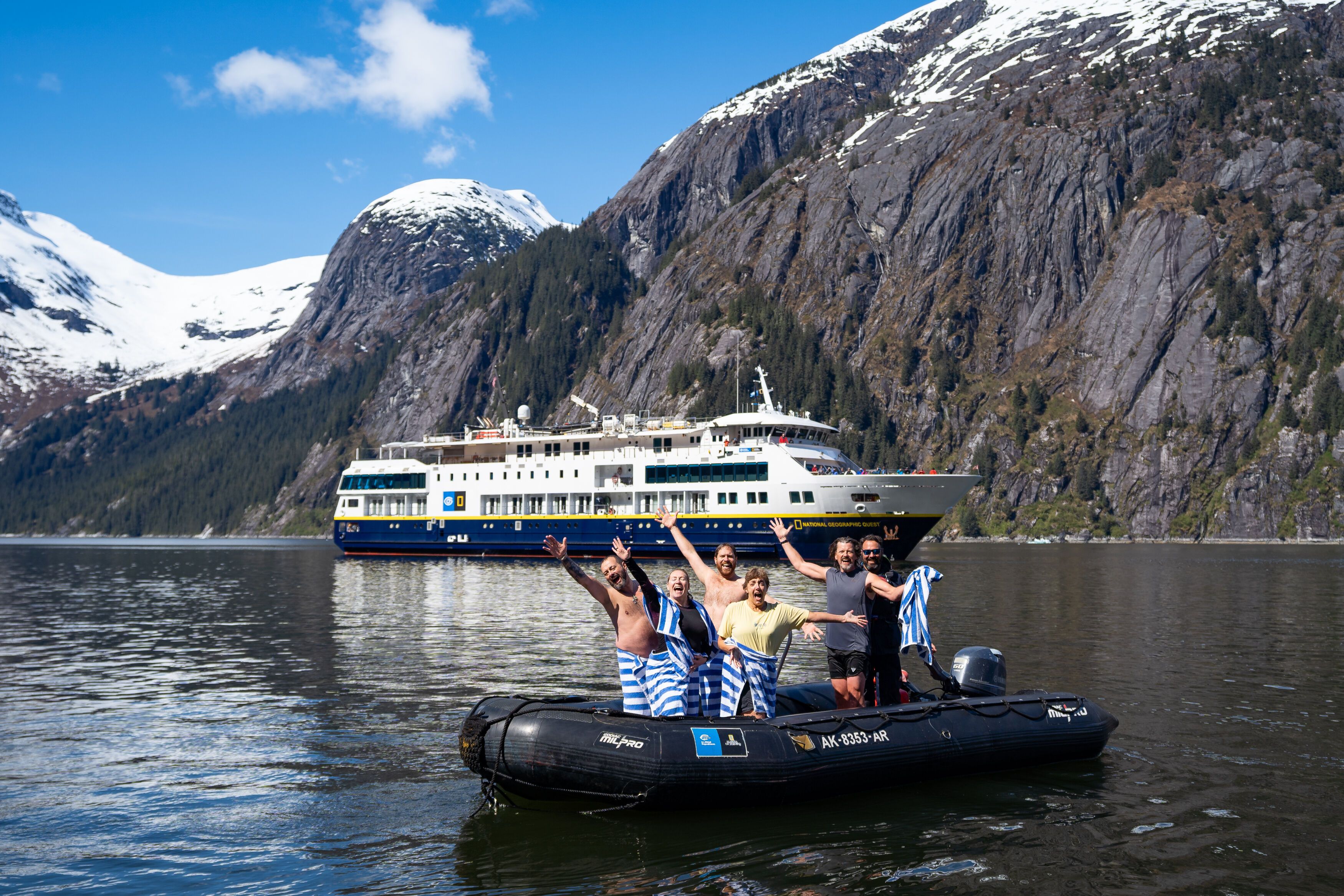 Long before the sun rose over the mountains surrounding the fjord known as Tracy Arm, our guests were lining the outer deck. First light came near 4:30 AM, and with it, excited travelers watched as National Geographic Quest navigated through the tight area known as, “The Narrows.” Throughout the morning, more and more people crowded onto the deck, aghast at the beauty of our surroundings in the fjord. Prior to breakfast, wellness specialist Allison Dickey led a distracted yet packed stretching class flanked by stunning granite on the sundeck.