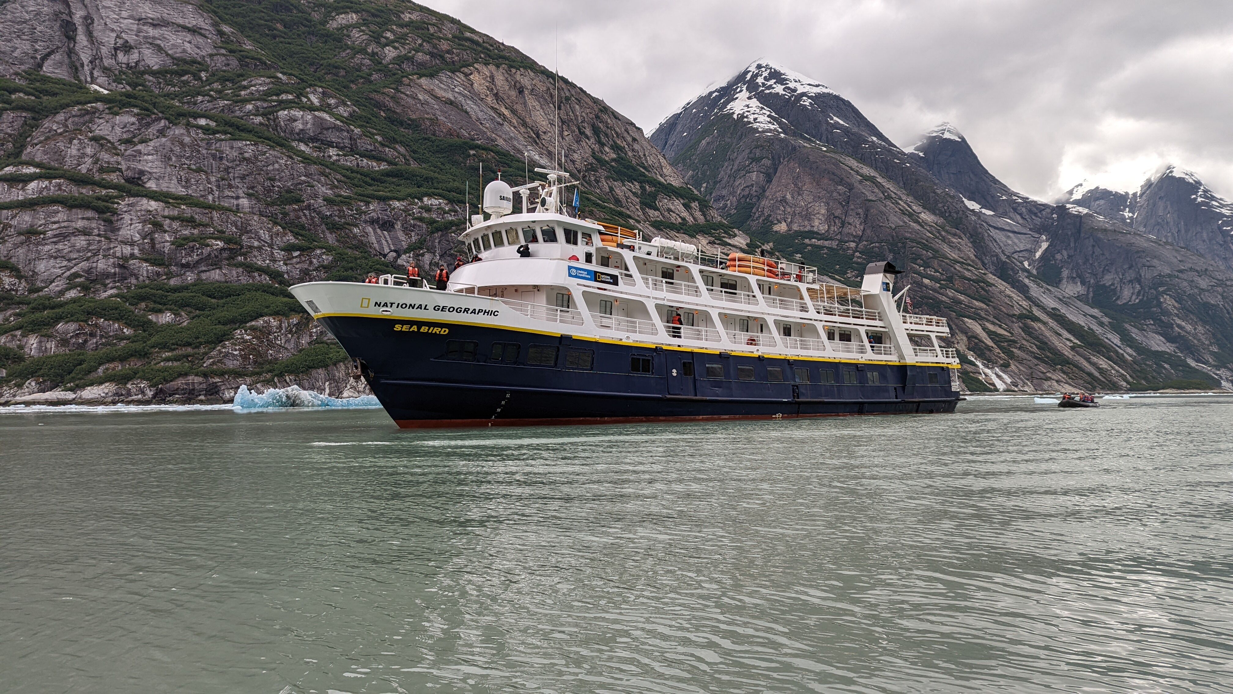 On the last full day of our voyage, we woke in Endicott Arm near the Dawes Glacier. We spent the morning enjoying Zodiac tours to the face of Dawes Glacier and watched multiple calving events. We were also able to spot several harbor seals, waterfalls, and a couple harbor porpoises on the way. After lunch we had the opportunity to participate in a polar plunge. Forty people decided to brave the frigid water for a short swim. Those of us not eager to jump into glacier water were able to watch from the bow. After the polar plunge, we warmed up on board as we started transiting towards Juneau. On the way, we stopped at a beautiful waterfall to once again admire the amazing natural beauty of Alaska. During our farewell recap, we were treated to a quick visit by a humpback whale. We ended our day with a slideshow made up of our favorite photos and memories of an amazing week on board National Geographic Quest .