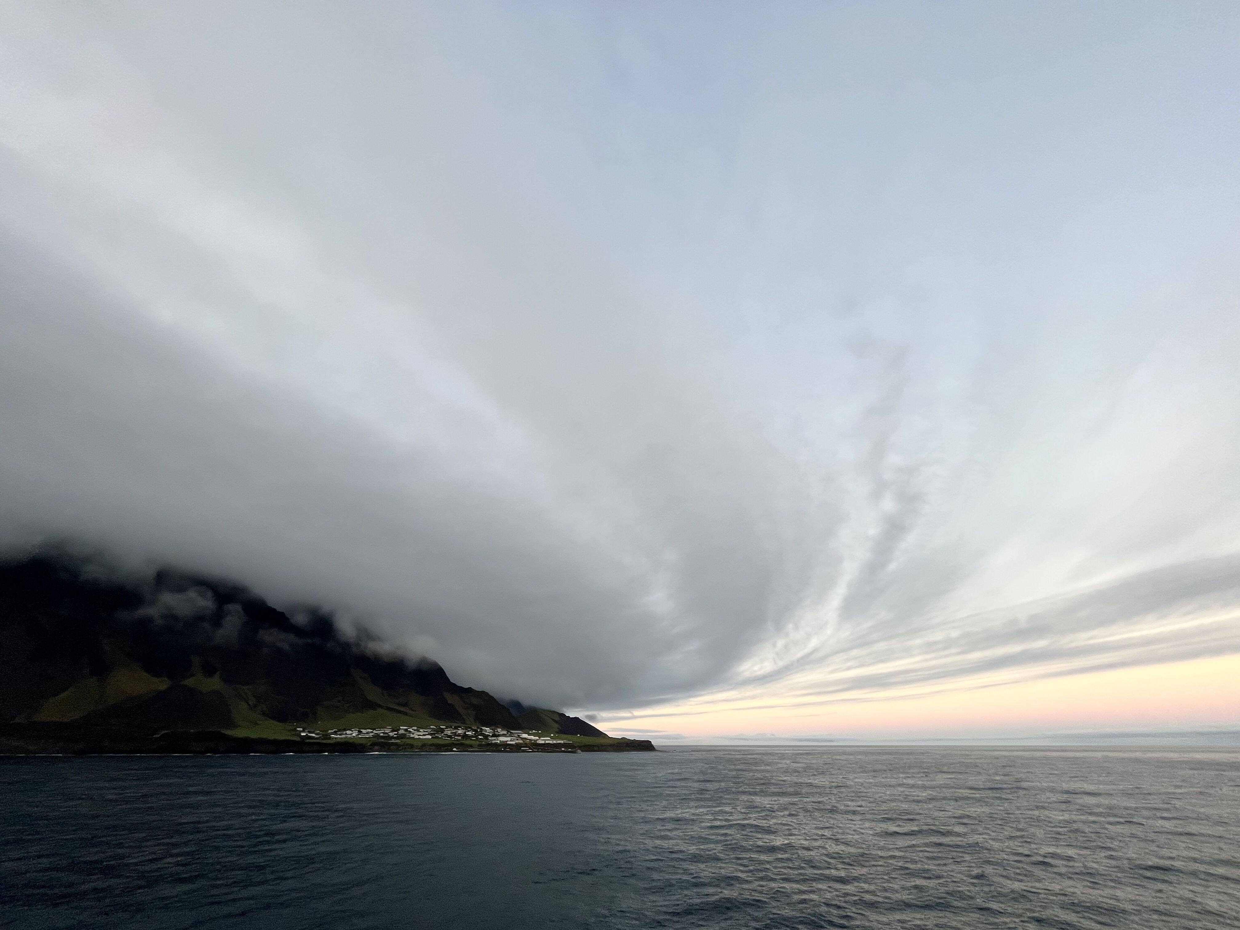 As the new day broke, we were witnesses to a beautiful sunrise over the island of Tristan da Cunha. The island rose precipitously, showing verdant lower slopes that rapidly disappeared under swirling, low clouds that shrouded the rest of the island.