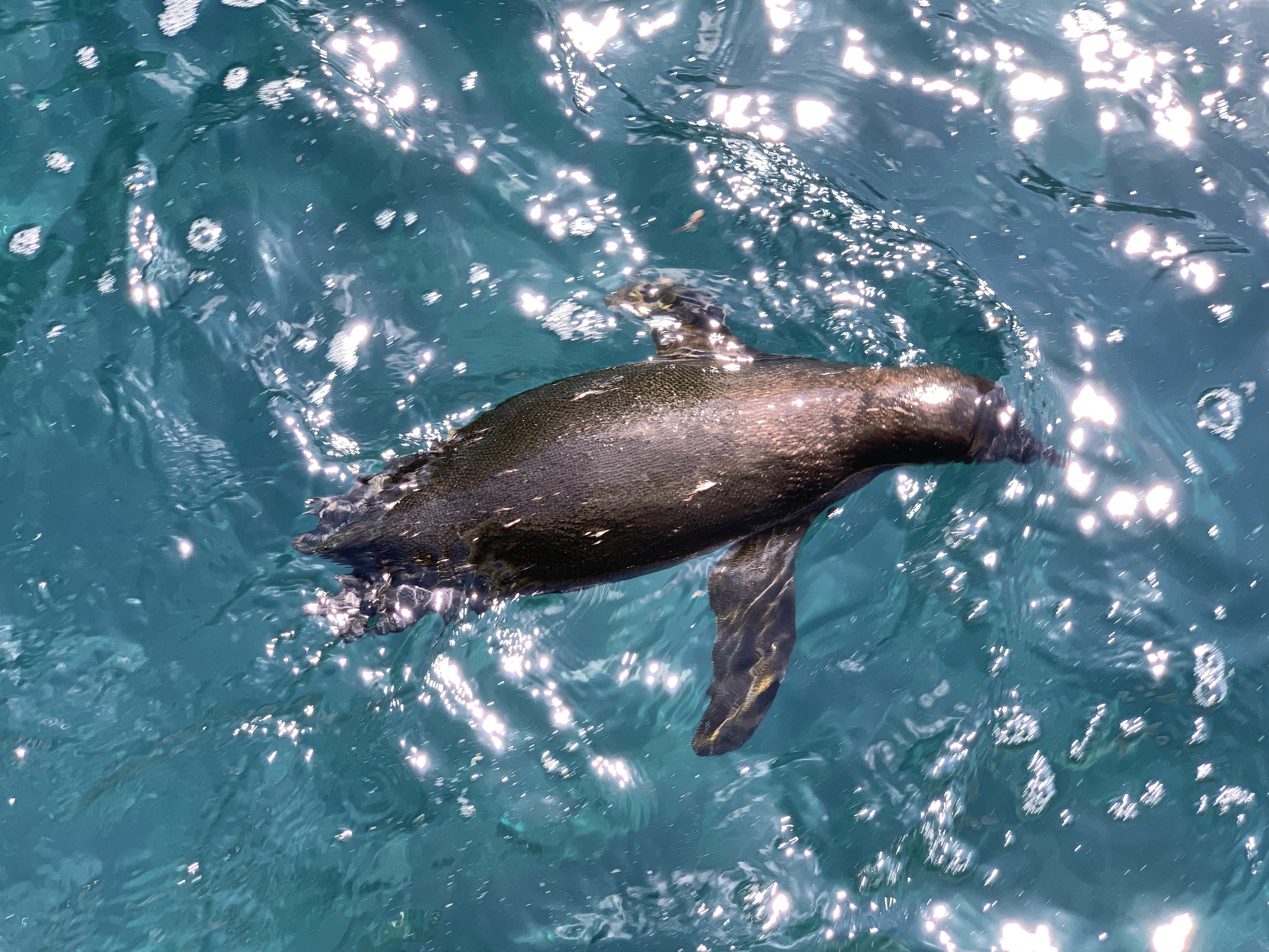 After lunch, we navigated towards Tagus Cove! This was a place with high cliffs where passing sailors traditionally wrote the name of the visitor ships on the walls. Historical graffiti reminds us how popular this site was for navigators in search of giant tortoises as source of food. Some of us opted to go kayaking along the coast of this protected cove, while others went paddle-boarding. We also had the opportunity to go snorkeling with Pacific green sea turtles, a large variety of fish and a couple of Galapagos penguins, speeding elegantly through the water in search of fish.