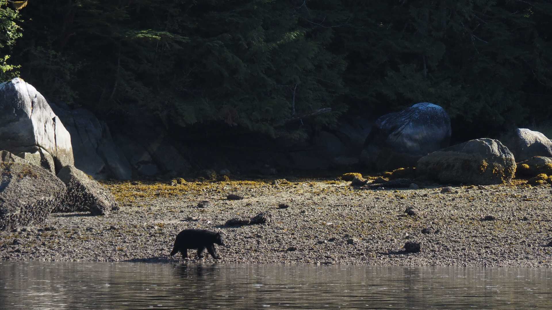 Zodiac cruises and kayak excursions commenced. At the far end of the inlet, water burst over steep dark rocks creating Verney Falls. Fish jumped, harbor seals dove into the froth of the waterfall, and even a sea lion joined in catching a salmon or two for lunch. The dark body of a black bear walking along a grassy beach caught our attention. This was all before noon.