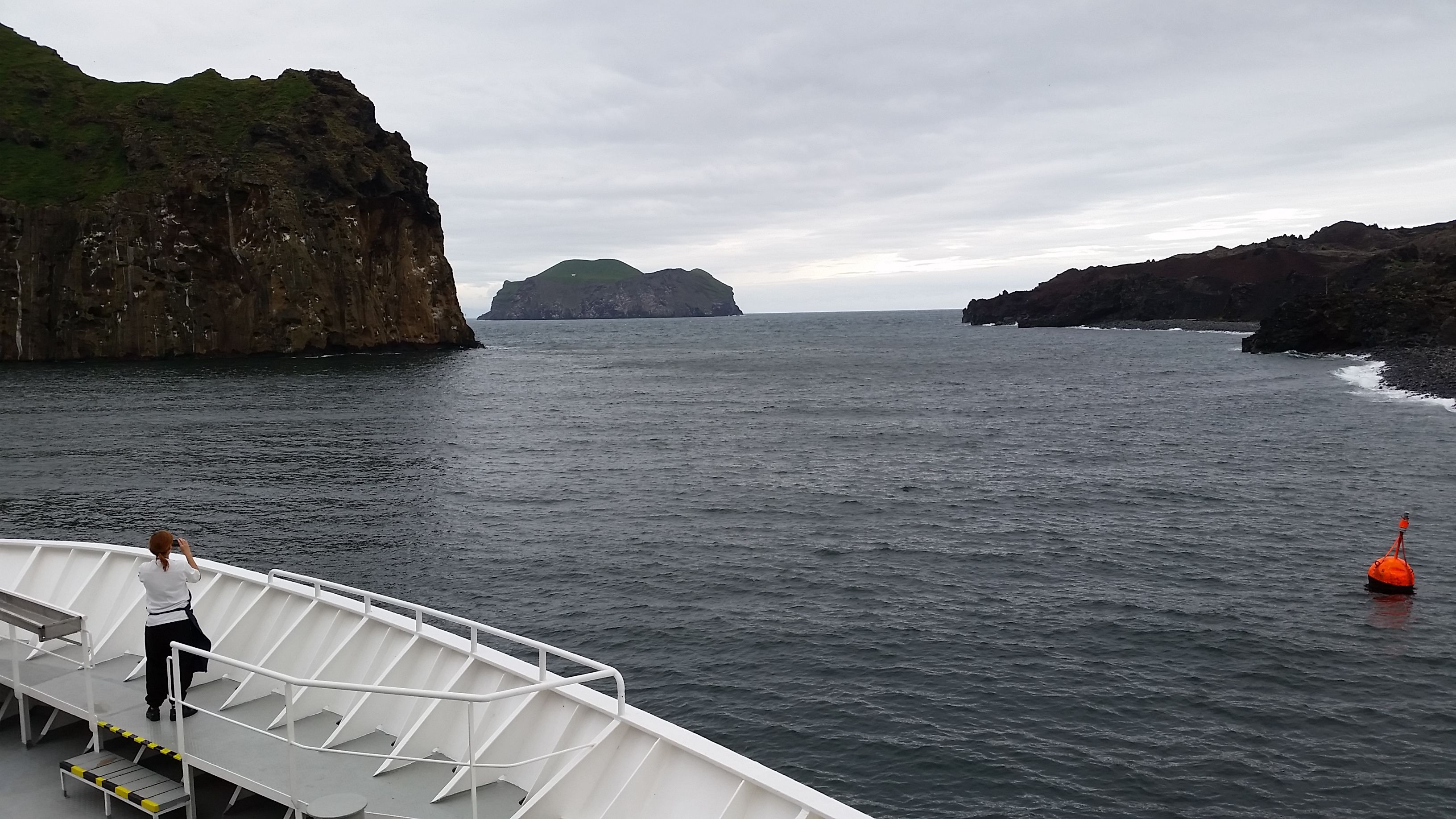 The guests aboard the National Geographic Explorer spent the day in the Vestmannaeyjar Islands off the southern tip of Iceland. In the morning, we cruised by the small eroded volcanic archipelago with a tremendous number of sea birds. We saw puffins, guillemots, and fulmars on the cliffs and flying around. The gannets stole the show with their beautiful yellow heads and large colonies. We also ran across a pod of gorgeous killer whales, so we watched this family group swimming and feeding for over 30 minutes.