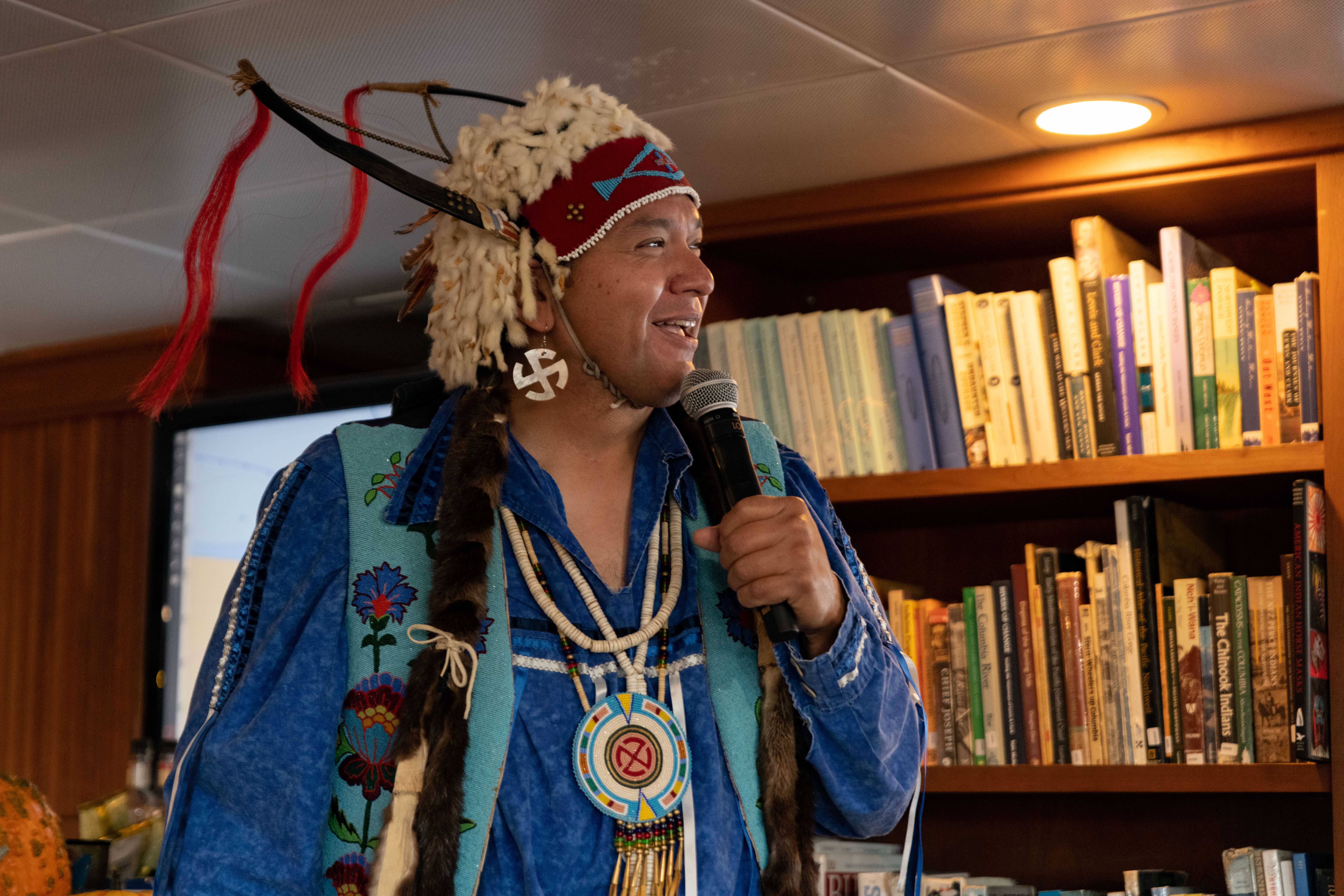 Following our morning meal, we are joined by Nez Perce storyteller JR Spencer. Wearing his Sunday best that includes an ermine hat, and braids wrapped in otter fur, JR certainly looks the part. But what stands out more than his dress is his mastery of his craft. By the time he is finished, I am convinced that not only did Coyote create the world, but that we were in his presence this morning. Who but the Trickster himself could have such a twinkle in his eye as he weaves Oreo cookies and Mighty Mouse into ancient chants?